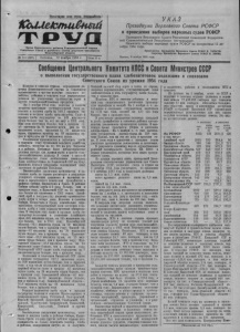 Пролетарии всех стран, соединяйтесь 1 • • « • • • « M ii m i i i K t i l i i i u i H M U i i u t t M t i M i u i i M H i M ' i t H i l i u i i t i i i M t t i u i i i u i i l i i t t n KbU Jetom ufom A T p v a Орган Карасукгкого райкома Коммунистической партии Советского Союза и районною Совета депутатов трудящихся Новосибирской области № 11 8 (1855) | Пятница, 12 ноября 1954 г. j Цена 15 к. УНА 3 Президиума Верховного Совета РСФСР о проведении выборов народных судов РСФСР Президиум Верховного Совета Российской Советской Федеративной Социалистической Республики постановляет: Назначить выборы народных судов Р СФ С Р на воскресенье 12 декабря 1954 года. Председатель Президиума Верховного Совета РСФСР М. ТАРАСОВ. Секретарь Президиума Верховного Совета РСФСР И. ЗИМИН. Москва, 9 ноября 1954 года. Сообщение Центрального КомитетаКПССиСовета МинистровСССР о выполнении государственного плана хлебозаготовок колхозами и совхозами Советского Союза из урожая 1954 года Колхозы и совхозы страны, осуществляя решения Коммунистической партии п Советского правительства о крутом подъёме сельского хозяйства, добились в текущем году значительных успехов по увеличению производства зерна и других сельскохозяйственных продуктов. На 5 ноября 1954 года колхозы и совхозы досрочно выполнили государственный план заготовок и закупок хлеба на 100,1 процента. Заготовки и закупки хлеба продолжаются. Сдано и продано хлеба государству на 289 миллионов пудов больше, чем на эту же дату в 1953 году. При этом поступило больше, чем в прошлом году: пшеницы на 91 миллион пудов, ржи на 65 миллионов пудов, крупяных на 37 миллионов пудов, фуражных культур на 89 миллионов пудов и кукурузы на 8 миллионов пудов. Увеличения производства и заготовок хлеба в текущем году труженики сельского хозяйства добились, несмотря на то, что на юге Украины и в районах Поволжья были неблагоприятные условия погоды для урожая зерна и других сельскохозяйственных культур. В связи с засухой Правительство сочло необходимым уменьшить план хлебозаготовок по Украинской ССР на 224,6 миллиона пудов и установить пониженный план заготовок по районам Поволжья. Значительное увеличение производства и заготовок хлеба по стране достигнуто в результате успешного освоения целинных и залежных земель и значительного повышения урожайности в районах Сибири, Казахстана и Урала. В районах Сибири собрано хлеба в 2 раза больше, чем в прошлом году, в Казахской ССР на 35 процентов больше по сравнению с 1953 годом. Алтайский край в текущем году увеличил производство хлеба почти в четыре раза. Колхозы и совхозы Сибири, Казахстана и Урала значительно перевыполнили государственный план заготовок и закупок хлеба и свои социалистические обязательства. В текущем году сдано и продано хлеба государству колхозами и совхозами Алтайского края 222 миллиона пудов, на 195 миллионов пудов больше, чем в 1953 году; Новосибирской области— 74,1 миллиона пудов, на 52 миллиона пудов больше, чем в прошлом году; Омской области— 63 миллиона пудов, на 30 миллионов пудов большо, чем в прошлом году; Красноярского края— 56,3 миллиона пудов, на 22 миллиона пудов больше, чем в прошлом году; Курганской области— 50,9 миллиона пудов, на 14 миллионов пудов больше, чем в прошлом году; Башкирской АССР сдано хлеба государству на 8 миллионов пудов больше, чем в прошлом году. , Колхозами п совхозами Казахской ССР сдано п продано государству 232,1 миллиона пудов, 