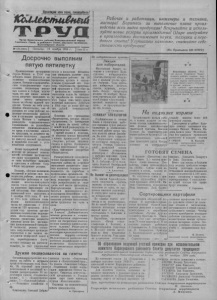 ►• «6г Нролетаряи всех стран, сошняйтесь! и » |Т |.н |Ш и » ц 1 » н * » и й и т » и н » т * » и « » и 1 м » и м 1 И |М » н ж н « м « м т н н и т Орган Карасукского райкома Коммунистической партии <оветского Союза н районною Совета депутатов трудящихся Новосибирской области № 121 (1858) Пятница, 19 ноября 1954 г. Цена 15 к. Рабочие и работницы, инженеры и техники, мастера! Боритесь за выполнение плана производства всех видов продукции! Вскрывайте и используйте новые резервы производства! Шире внедряйте в производство достижения науки, техники и передового опыта! Улучшайте качество, снижайте себестоимость продукции! (Из Призывов ЦК КПСС) Досрочно выполним пятую пятилетку j т Промышленные предприятия , города Москвы в 1954 году добились новых успехов в выполнении производственных планов. Вступая впредоктябрьское социалистическое соревнование, коллективы передовых заводов и (}абрик, подсчитали, что они имеют возможность досрочно выполнить задания пятого пятилетнего плана нообъему валовой продукции. Приняв на себя повышенные обязательства, они обратились ко всем рабочим,инженерно-техническим работникам и служащим предприятий города Москвы с призывом развернуть социалистическое соревнование за дальнейшее повышение производительности труда и улучшение качества продукции, за досрочное выполнение пятилетних заданий по выпуску валовой продукции и выработке изделий в уста новленном ассортименте. Почин предприятий столицы исходит из реальных возмож ностей, которыми располагают все наши предприятия. Следует лишь настойчиво выявлять и приводить в действие богатейшие внутренние резервы. ‘ Недавно, обсудив начинание москвичей и взвесив свои воз можности, рабочие, пнженерно- тохнические работники и служащие молочно-консервного завода также решили бороться за досрочное выполнение пя той пятилетки. Они обязались пятилетнпй план выполнить к 1 октября 1955 года. К концу 1955 года добиться новы шенпя производительности труда по сравнению с 1950 годом на 110 процентов. Вбудущем году провести организационно-технические мероприятия, обеспечивающие значительное увеличение мощности основных цехов без расширения производственной площади. В частности, решено установить вакуумаппарат производительностью в две тысячи килограммов испаренной влаги в час, переоборудовать форсу ночную сушилку на распылительную, за счет укрупнения цохов и внедрения механизации уменьшить наличие вспомогательных рабочих на 20 процентов, пустить в эксплуатацию сушильный цех. Снизить себестоимость выпускаемой продукции в 1955 году на 7 процентов по сравнению с нынешним годом. За пятилетку выработать пз сэкономленного сырья семь тысяч пудов молочных консервов. Добиться в 1955 году не менее 400 тысяч рублей сверхплановой экономии. Поистине это грандиозные обязательства, которые вполне осуществимы. За претворение их в жизнь на заводе сейчас с новой силой развернулось социалистическое соревнование. Горячий отклик и поддержку встретил прпзыв москвичей у членов промысловой артели «Энергия», рабочих питцеком- бивата и других. Предприятия района подсчитывают свои резервы, принимают конкретные обязательства. Развернувшееся социалистическое соревнование на предприятиях района за досрочное выполнение пятилетнего задания возлагает большую ответственность на партийные и профсоюзные организа