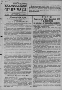' е-л / У -* > ■Jk ■¥ Пролетарии всех стран, соединяйтесь! В наступающем новом году советский народ, вдохновляемый великими идеями Маркса— Энгельса*— Ленина— Сталина, будет трудиться с большей энергией, чтобы сделать наше Отечество ещё T P V 0 Орган Кграсуксиого райкгуа Коммунистической партии Советского Союза и районного Совета депутатов трудящихся Новосибирской области могущественнее, X 2 Г1877)| Среда, 5 января 1955 г. j Цена 15 к. Новогодняя речь Председателя Президиума Верховного Совета СССР тов. К. Е. ВОРОШИЛОВА Дорогие товарищи! Дорогие граждане нашей любимой Родины— Союза Советских Социалистических Республик! Сердечно поздравляю Вас с наступающим Новым годом! С чувством глубокой радости мы отмечаем, что за истекший год усилиями советских людей наша Родина стала еще богаче, еще сильнее. Минувший год был годом дальнейшего развития социалистической промышленности, подъема сельского хозяйства и расцвета науки и культуры нашей многонациональной Родины. Эти достижения—результат созидательного труда героического советского народа—рабочих, колхозников и интеллигенции. Это они, неутомимые строители коммунистического общества и славные борцы за мир и счастье людей,руководимые своей Коммунистической партией, уверенно идут к новым победам. В наступающем новом году советский народ, вдохновляемый великими идеями Маркса—Энгельса—Ленина—Сталина, будет трудиться с большей энергией,чтобы сделать наше Отечество еще могущественнее. Вступая в новый, 1955 год, гордые своими успехами, мы с удовлетворением отмечаем также, что в результате настойчивых усилий Советского Союза, Китайской Народной Республики и всех миролюбивых народов в минувшем году произошла некоторая разрядка международной напряженности. Борьба за прочный и длительный мир принесла свои плоды. Но это не устраивает врагов мира. Не считаясь с волей своих народов и забыв уроки истории, правящие круги некоторых западных держав продолжают вести агрессивную политику, чреватую опасными последствиями. Миролюбивые народы не могут пройти мимо того факта, что западные державы, возрождая в центре Европы германский милитаризм, осложняют обстановку и усиливают опасность новой войны. Уважаемые граждане, мужчины и женщины, юноши и девушки зарубежных стран1 Истекший год, к счастью всего человечества, был годом мира. Я не сомневаюсь, что простые, честные люди всех стран не хотят войны, они хотят жить в мире и братском согласии. Противникам мира не удастся осуществить их планы, если народы возьмут дело мира в свои руки и будут его отстаивать до конца. Советский народ в братском единении с великим китайским народом и всеми народами демократических стран верят, что и наступающий новый год будет годом дальнейшего упрочения мира во всем мире. На недавнем Московском Совещании миролюбивые государства Европы продемонстрировали непоколебимое единство, сплоченность и волю к борьбе за великое дело мира и безопасность европейских народов. Советские люди, как и все простые люди за рубежом, приветствовали Декларацию Московского Совещания, призывающую к созданию системы коллективной безопасности в Европе. Советский народ—хозяин своей великой-страны, передовой борец за мир, свободу и счастье всего человечества—вступает в новый год полный творческих сил и неиссякаемой энергии, готовый с ещ
