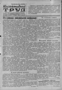 Пролетарии всех стран, соединяйтесь! 1СоилеЛсти£ншй Орган Кграсуковрго райкома Коммунистической ивртпв Советского Союва и районного Совета депутатов трудящихся Новосибирской области__________________ Товарищи делегаты 29-й районной комсомольской конференции! Используя почетное право, данное вам первичными комсомольскими организациями, при помощи острой критики и самокритики смело вскрывайте недостатки и упущения в работе райкома ВЛКСМ и первичных организаций, намечайте пути их устранения, Л 3 (1878)| Пятница, 7 января 1955 Г. | Цена 15 к. 29-ярайноняа Завтра открывается 29 районная комсомольская конференция. Это—важное событие в жизни молодежи района. Комсомольцы подведут итоги работы за год и наметят мероприятия на дальнейший период. Комсомольская организация, выптяяя решения XII съезда ВЛКСМ, под руководством партийной организации проделала значительную работу по ком мунистическому воспитанию молодых колхозников, рабочих и служащих. На основе повышения уровня организационной и политической работы комсомольские организации усилили свое влияние на молодежь. За гоп принято в члены ВЛКСМ 562 человека. Комсомольцы и несоюзиая молодежь района более активно стали участвовать в решении хозяйственных и политических задач, стоящих перед районом, многие из них являются передовиками сельскохозяйственного производства, промышленности и транспорта. Комсомольцы нынче внесли достойный вклад в расширение посевных площадей зерновых за счёт освоения целинных и залежных земель, принимали активное участие в заготовке кормов, в проведении уборки урожая и хлебозаготовок. Сейчас в районе создано 23 ком- сомодьско-молодежных транспортных бригады по подвозке кормов к местам зимовки скота. Однако наряду с положительными примерами имеется еще очень много недостатков как в работе райкома комсомола, так и первичных организаций. Секретари райкома комсомола тт. Завьялов и Чу- дакова, а также заведующие отделами и инструкторы по зонам МТС до сих пор не отреклись от кабинетного метода руководства, недостаточно оказывают практической помощи на местах, не проявляют оперативности в решении первоочередных задач. Работники аппарата райкома, надеясь на силу рассылаемых директив^ мало бывают в первичных организапиях, не являются организаторами среди молодежи. В районе очень много передовиков, которые своим добросовестным трудом завоевали всеобщий почет и уважение. Однако опыт их работы плохо распространялся. Колхозы, МТС и совхозы сейчас все свое внимание направляют на благополучное проведение зимовки скота, на своевременную и качественную подготовку к полевым работам. В решении этих вопросов авангардную роль должны занять комсомольцы и вести за собой всю несоюзную молодежь. К сожалению, . некоторые первичные организации ВЛКСМ мало проявляют беспокойства о развитии общественного животноводства, безучастно относятся к проведению комплекса зимних агротехнических мероприятий. Секретари комитетов комсомольских организаций Октябрьской и Карасук- ской МТС тт. Глазунов и Стрижов, например, считают, что социалистическим соревнованием среди молодых механизаторов должен заниматься только профсоюз. Они даже не знают, как работают молодые трактористы на подвозке кормов, на ремонте техники, кто из них идет впереди, кто отстает, кому и какая требуется помощь