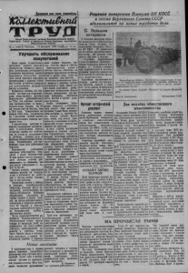 18 февраля 1955 года, № 21 Письмавредакции) Досрочно сдают молоко к о л л е к т и в н ы й т р у д Колхозники сельхозяртелг «Пятилетка», иия навстречу выборам, досрочно выполняют свои обязательства по поставкам молока госудаоству. Так, например, И. Горбатено. А. Бендер, Е. Воронежский, А. Дуквин и другие взяли обязательство выполнить годовой план поставок молока к 27 февраля. М. Бойкова. По два— три рейса в день Трактористы И. Очереденко и Н. Ткалун, работая на подвозке кормов к фермам колхоза «Путь Ленина», ежедневно ва тракторе «ДТ—54» дерас- лают по 2—3 рейса ва стояния 6 километров. В составе их бригады хорошо работают накладчики гена комсомолка А. Ткалун. R. Бель- мая, В. Ткаленко. Н. Гасило. Об эксплуатации дорог Безответственно относятся к сохранению зимних автогужевых дорог трактористы МТС и совхозов района. При переезде из одного с е т в другое они ездят не по полю, где трактор свободно может пройти, а по наезженным санным дорогам, ломая и превращая их в негодное для проезда и перевозки грсзов состояние. Заведующему дорожным отделом райисполкома т. Стре- моухову необходимо принят* меры к тем, кто портит проселочные дороги. И. Скляренко, председатель Октябрьского сельсовета. Зарентабельнуюработусовхоза Когда кончится волокита? В июне прошлого года я был принят в Ч1РНЫ профсокт. Председатель местного комитета 3-й фермы совхоза «Октябрь» Т. К'рноухов не выдал сразу мве профсоюзный билет, <бещая сделать это в ближайшее время. С тех нор прошло больше семи месяцев, вместо т. Кор- ноухова председателем местного комитета сейчас избран т. Зырянов. Но до сего време ни я не получил профсоюзный билет. Г. Иванов. Нарушитель парадка должен быть паказап Часто заготовитель Карасук- СКОЙ конторы «ЗаГоТЖИВ- сырте» Петров выходит на улицы села Благоаалного и стр ляет из малоколибервой винтовки в собак, несмотря на то, что на улице находятся — — ■ ■■— 1М В " дети и возможны несчастные случаи. Неоднократно Петрова предупреждали за нарушение общественного порядка, но он не унимается. Пора принять более строгие меры. 1. Пикин. Говорун объезжал поля, в в о з - |на я от тракториста и кончая духе стоял неумолчный гул | копнильщиком и шофером, ра- моторов. В разгаре была убор- б тают с каким-то упоением ка урожая Миновав участок, с которого уже убран хлеб, бригадир сворачивает к пшеничному массиву. Густая чистая пшеница шумит упругими стеблями. На дальнем конце массива появляется, сверкая на солнце металлическими частями, комбайновый агрегат и медленно плывет навстречу. Уже видно сосредоточенное, загорелое, припудренное пылью лицо комбайнерки Екатерины Кравцовой. Бригадир остановил лот а ь, невольно любуясь работой агрегата. Комбайн проходит мимо. Григорий Федорович подъезжает к вороху соломы, набирает в горсть полову и провеивает ее ва ветру. В лодони нет ни зернышка. Все, что уродила земля ,— в бункере комбайна. —У Кравцовой, ка к всегда, работа отличная,—с удовлетворением отметил бригадир. А агрегат уже далеко. Его начальник Екатерина Кравцова внимательно следит за работой молотильного аппарата, чутко вслушивается в работу мотора. У всех членов агрегата строго разграничены обязанности. Хлеб убирают днем и ночью. 843. Эта цифра появилась не только в сводках или в отчете МТС, а о ней писали газеты, сообщало радио. 843 гектара убрала за сезон Екатерина Васильевна и намолот