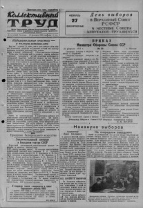 Дродтрвв Bttx cipiB, содйнвйтесь Т Р У Д s т а Ш т фщ* IШтГ.: Орган Карасувского райкома Коммунистической партия Советского Союза и районного Совета депутатов трудящихся ______ Новосибирской области ______________ ___ № 24 (1898)| Пятница, 25 февраля 1955 года| цена 15 коп. Избирательные участки — в полную готовность Два дня осталось до выборов. Участковые комиссии заканчивают последние приготовления к приему избирателей. Чтобы день голосования действительно превратился во всенародный праздник, избирательным комиссиям необходимо ховошо подготовиться к нему, предусмотреть все до мелочей. Всесторонне готовятся в этому дню на избирательных участках Калиновского сельского Совета. Здесь проя в л я я заботу о подготовке помещений для голосования, отдыха избирателей, о их культурном обслуживании, работе торговых точек и т. д. Участковым комиссиям оказывают помощь партийные, комсомольские организации, сотрудники и актив сельского Совета. Однако нельзя этого сказать об избирательных участках Анисимовского сельского Совета (председатель т. Алехин). Здесь имеется масса недоделок: не оборудованы помещения, не установлены кабины. Почему- то эти вопросы откладываются на последний день. Подобные недостатки имеются и на некоторых избирательных участках города. Работа по окончательному оборудованию помещений избирательных участков, установке кабин для голосования, подготовке избирательных урн не терпит отлагательства. Заранее надо позаботиться об отоплении, освещении, о мерах противопожарной безопасности, о создании в лень выборов всем избирателям условий для культурного отдыха. Сейчас уже следует составить и уточнить списки избирателей, к которым необходимо будет послать на дом переносную урну или привезти их на избирательный участок. Культ- просветучреждения должны на этот день составить конкретный план мероприятий по культурному обслуживанию избирателей. Торговые организации также обязаны проявить максимум заботы об обслуживании трудящихся. Выборы в Советы—всенародный праздник. Надо, чтобы в этот день по-нраздничному выглядели избирательные участки, агитпункты, предприятия и учрежжния. Нарядный и привлекательный вид должны принять все улицы. Однако как в селах, так и в городе мало проявляется об этом беспокойства. На здапвях нет флагов, портретов руководителей партии и правительства, диаграмм и таблиц, рассказывающих об экономическом и культурном росте страны, нашего района, нет лозунгов и плакатов, извещающих о дне выборов. В подготовке к выборам нет мелочей—здесь все важно. Необходимо создать такие условия, чтобы избиратели дружно явились к избирательным урнам и все, как один, отдали свои голоса за кандидатов народного блока коммунистов в беспартийных. Праздник белорусского искусства Заключительный концерт в Большом театре СССР Волнующей демонстрацией дружбы и единства народов СССР, яркого расцвета много- национальвой советской культуры явилась декада белорусского искусства и литературы в Москве. Десять дней на московской сцене шли спектакли крупнейших театров Белоруссии, познакомивших трудящихся столицы с достижениями драматического, оперного и балетного искусства БССР. Около ста тысяч москвичей побывали на спектаклях, концертах и вечерах белорусского искусства и литературы. 21 февраля в Государственном Академическом Большо