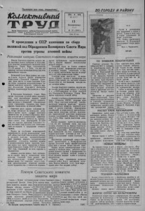 Пролетарии всех стран, соединяйтесь! « m b iw i iH u u u ii n iu ii iH lU u <u ui iiu iu ui u ti iU m ii iin « iiu iiH H u n u uw u uu u M i НО ГОРОДУ И РАЙОНУ ГСЫишспшДиай Орган Карасукского райкома Коммунистической партии Советского Союза в районною Совею ^еиутвтов трудящихся Новосибирской области 195» * 1956 М А Р Т 15 Воскресенье № 31 (1906) Цена 15 коп О проведении в СССР кампании по сбору подписей под Обращением Всемирного Совета Мира против угрозы атомной войны Резолюция пленума Советского комитета защиты мира Пленум Советского комитета защиты мира выражает полное одобрение и поддерживает решения расширенного заседания Бюро Всемирного Совета Мира, состоявшегося 17—19 января с. г. в Вене, так как эти решения отвечают жизненным интересам всех миролюбивых народов. Всемирный Совет Мира призвал все народы Европы бороться против возрождения милитаризма в Западной Германии. Советские люди вместе со всеми народами Европы полны решимости воспрепятствовать созданию немецкого вермахта, добиться мирного объединения Германии и обеспечить прочную коллективную безопасность в Евро- ие. В Обращении Всемирного Совета Мира Против подготовки атомной войны выражена воля всех миролюбивых народов, людей разных национальностей, разных политических взглядов и убеждений, объединенных одним стремлением сохранить мир, предохранить человечество от атомной войны. Советские люди— верные поборники мира, твердо выступают за запрещение атомного и других видов орудия массового уничтожения, за всеобщее сокращение обычных вооружений и установление эффективного международного контроля за проведением в жизнь этих мероприятий. В i960 году всё вфослое население Советского Союза поставило свои подписи под Стокгольмским воззванием о запрещении атомного оружия. Борясь за ослабление международной напряженности, против развязывания атомной войны, Советский Союз политике диктата и атомного шантажа противопоставляет свою политику мирного сосуществования различных государств, политику дружбы и взаимопонимания между народами, которая нашла свое яркое выражение в Декларации Верховного Совета СССР от 9 февраля 1956 года, обращенной ко всем народам и парламентам. Атомная энергия должна быть поставлена на службу мира и процветания человечества. Советский Союз являет пример использования атомной энергии в мирных целях. Все советские люди с боль щим удовлетворением встретили решение своего правительства о готовности передать другим государствам научно-технический опыт в области мирного использования атомной энергии. Советский народ не боится атомного шантажа и угроз американских агрессоров и выражает твердую уверенность в том, что и другие миролюбивые народы не дадут запугать себя поджигателям войны. Советские люди выступают за запрещение атомного оружия и прекращение его производства потому, что они хотят оградить человечество от тех бедствий, которые несет атомная война. Пленум Советского комитета защиты мира считает необходимым начать с 1 а треля с. г. в СССР кампанию по сбору подписей под Обращением Всемирного Совета Мира против подготовки атомной войны. Пленум с глубоким удовлетворением принимает заявления ВЦСПС, Академии наук СССР, Союза советских писателей, Антифашистского комитета советских женщин, Антифашистского комитета советской молодежи и других советских, общественных ор