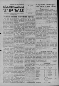 Пролетарии всех стран, соединяйтесь! ЮоиЛеЛгти&тй Орган Карасукского райкома Коммунистической партии Советского Союза и районного Совета депутатов трудящихся Новосибирской области Цена 15 коп Севу есть своя пора— сей, пока земля сыра! Напряженный труд Великая победа советского народа Прошло десять лет с тех пор, как пароды Советского Союза победоносно завершили Великую Отечественную войну, одержав всемирно-историческую победу над фашистскими агрессорами. 2 мая 1945 года советские войска водрузили Знамя Победы над Берлином, а 8 мая гитлеровское командование вынуждено было подписать акт о полной п безоговорочной капитуляции. Великая Отечественная война Советского Союза против фашистской Германии была справедливой, освободительной войной. В борьбе с фашистскими захватчиками народы нашей страны отстаивали честь, свободу и независимость своей социалистической Родины. Начиная войну против Советского Союза, немецко-фашистская армия представляла собой мощную военную машину, опиравшуюся на экономические и людские ресурсы не только своей страны, но и большинства оккупированных гитлеровской Германией европейских государств. Однако никакие вражеские силы не смогли сломить волю, мужество и стойкость великого советского народа. 15 дни суровых испытаний Коммунистическая партия во главе с верным учеником и продолжателем дела великого Ленина П. В. Сталиным выступила как вдохновитель и боевой руководитель советского народа и его Вооруженных Сил. В тяжелых условиях военного времени партия сплотила народы нашей страны вокруг Центрального Комитета и Советского правительства. Она неустанно разъясняла советским людям значение и цели войны, вооружила народ четкой программой действий, мобилизовала рабочий класс, колхозное крестьянство, советскую интеллигенцию на самоотверженный труд, вселила в народ непоколебимую уверенность в победе. Благодаря огромной организаторской и воспитательной работе партии в нашей стране было создано слаженное и быстро растущее военное хозяйство. Наши Вооруженные Силы имели надежный н прочный тыл. В результате самоотверженного труда рабочего класса Советская Армия уже к началу 1943 года имела танков, самолетов и другого вооружения н боеприпасов больше, чем немецко-фашистская армпя. Наше социалистическое сельское хозяйство, преодолевая многочисленные трудности, обеспечило бесперебойное снабжение армии, населения продовольствием, а промышленности сырьем. Советские Вооруженные Силы, руководимые Коммунистической партией, своей стойкостью, героизмом и отвагой сорвали коварные планы врага. В многочисленных битвах л сражениях Советская Армия заслужила неувядаемую славу армии-победителышцы. В годы войны личный состав армии и флота проявил в боях беспримерное мужество и высокое воинское мастерство, верность воинскому долгу и беспредельную преданность своей Отчизне. За геройство и подвиги в дни войны миллионы советских людей были награждены орденами и медалями СССР, одиннадцать тысяч воинов былп удостоены высокого звания Героя Советского Союза. В Великой Отечественной войне советский народ и его Вооруженные Силы с честью выполнили свою великую освободительную миссию. В результате разгрома фашистских агрессоров в ряде стран Европы и Азии трудящиеся свергли реакционные режимы и установили 