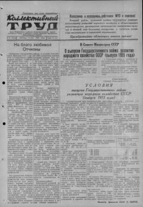 о Пролетарии всех стран, соединяйтесь! KoJMjcmu£md ЛЖЛ JDI Орган Карасукского райкома Коммунистической партии Советского Союза и районного Совета депутатов трудящихся Новосибирской области № 57 (1931) | Пятница, 13 мая 1955 года | Цена 15 коп. Колхозники иколхозниц ,ыработники МТС и совхозов! Каждый рубль, отданный взаймы государству, поможет дальнейшему развитию зернового хозяйства и общественного животноводства, расширению производства технических культур и овощей, еще большему внедрению в сельское хозяйство механизации и передовой агротехники. Приобретайте облигации нового займа! На благо любимой Отчизны ч Опубликовано постановление Совета Министров СССР о выпуске Государственного займа развития народного хозяйства СССР (выпуск 1955 года). Новый заем выпущен в целях привлечения средств населения для финансирования мероприятий по дальнейшему развитию народного хозяйства СССР. Средства, которые поступят в государственный бюджет от размещения нового займа, будут использованы для дальнейшего укрепления могущества советского государства, роста социалистической промышленности и сельского хозяйства, для повышения материального благосостояния и культурного уровня жизни народа. Постановление правительства о выпуске нового займа встречено с огромным воодушевлением на предприятиях, колхозах, МТС п совхозах района.Повсеместно, как только это постановление было объявлено по радио, дружно ц организованно началась подписка на Государственный заем. Рабочие, колхозники, интеллигенция отдают свои сбережения взаймы государству с полным сознанием того, что новый заем будет способствовать успешному осуществлению грандиозных планов коммунистического строительства в нашей стране, что средства займа будут направлены на благо любимой Родины. Подписываясь на новый заем, труженики города и деревни демонстрируют свое великое и нерушимое единство, свою тесную сплоченность вокруг Коммунистической партии и Советского правительства. Трудящиеся знают, что неуклонное улучшение материального благосостояния народа, максимальное удовлетворение постоянно растущих материальных и культурных потребностей всего общества всегда являлись п являются предметом особой заботы Коммунистической партии и Советского правительства. Иод руководством Коммунистической партнп п Советского правительства наша великая Родина идет по пути нового мощного подъема экономики и культуры. Быстрыми темпами растет наша тяжелая индустрия—основа основ развития всех отраслей социалистического народного хозяйства и блогополучшС народа, резко возросло производство товаров народного потребления. Огромная забота проявляется о развитии сельского хозяйства. В решениях Пленумов ЦК КПСС разработана широкая программа развития всех отраслей сельского хозяйства. Из года в год растут в нашей стране денежная и реаль-! ная заработная плата рабочих и служащих, доходы крестьян. Большие доходы получают трудящиеся п за счет сбережений, которые они образуют, подписываясь на Государственные займы. Так, только за 1955 год население страны, получает но займам 12,2 мил- \ лиарда рублей против 10 ,2 ! миллиарда рублей в 1954. году. Советское правительство щедро ассигнует средства на социально-культурные мероприятия, здравоохраненпе, жилищное строительство и т. д. Средства от нового займа, 