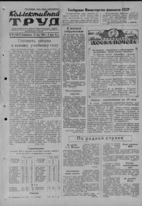 ч Пролетарии всех стран, соединяйтесь! 1CbUUe&nu£Hsui Т Р У Д Оргап Карасукского райкома Коммунистической партии Советского Союза и районного Совета депутатов трудящихся Новосибирской области №61 (1935) | Воскресенье, 22 мая 1955 г. | Цена 15 к. Готовить школы ебному году Сообщение Министерства финансов СССР к новому уч Перед работниками народного образования и всей общественностью сейчас стоит большая задача— всесторонне и своевременно подготовиться к новому учебному году. Мы имеем в прошлом хорошие примеры по привлечению общественности к подготовке школьных зданий. Отеческую заботу о школах проявляют и нынче члены ряда сельхозартелей. Общее собрание колхозников сельхозартели «Вперёд к коммунизму», например, приняло решение построить новую се- милетшою школу в селе Ши- лово-Курье на 160 мест. Уже Отпущены средства и идёт заготовка стройматериалов. При рассмотрении производственного плана члены колхоза пменп Андреева выделили I0 тысяч рублей на ремонт интерната при Хорошпнской средней школе. Для этого же интерната отпускает средства колхоз имени Сталина. Колхозом именп Андреева оказывается деятельная помощь в ремонте и других сельских школ, находящихся в полеводческих бригадах. Колхозы— инициаторы движения по оказанию помощи школе (имени Андреева, име- нп Дзержинского, «Вперёд к коммунизму» и другие) своими делами призывают все колхозы и совхозы района принять деятельное участие и строительстве п переоборудовании существующих школьных зданий, вызываемом нуждамп политехнического обучения. Большую заботу о школах и других детских учреждениях, а также об улучшении бытовых условий "учителей проявляет Калиновский сельский Совет. Однако далеко не везде обстоит благополучно с организацией ремонта школ и квартир учителей, с заготовкой и доставкой топлива, с приобретением учебного оборудования и инвентаря. ВКарасукской средней школе, например, ничего не делается по приобретению спортивного инвентаря. В Ани- симовской школе не проявляют заботы о пополнении физкаби- нета, ничего не делается ни директором тов. Косаревым, ни председателем сельсовета тов. Брославским по освоению отпущенных общественностью средств самообложения на капитальный ремонт школы. В решениях сентябрьского Пленума ЦК КПСС указывает ся, что экономически мощные колхозы по мере роста их общественного хозяйства имеют полную возможность часть своих средств использовать в целях дальнейшего подъема культуры и просвещения. Ос, нако несмотря на имеющиеся возможности некоторые колхо зы школам не оказывают никакой помощи, вопросами на родного просвещения совсем не занимаются. К их числу можно отнести колхоз «Новая семья» (председатель тов. Черкасский). В работе по подготовке к будущему учебному году не должно быть самотека и неорганизованности. Долг руководителей школ, работников народного образования, председателей сельских Советов, секретарей парторганизаций— использовать все резервы для лучшей организации и своевременного завершения подготовки школ к новому учебному году. Соревнование ко л хо зо в , МТС и совхозов н а весенних полевы х р а б от а х па 2 0 м а я 1955 г. (в п р о ц е нт а х к плану ) Наименование колхозов, МТС и совхозов Посев яровых Наименование колхозов, МТС и совхозов Посев яровых всего Па о а ! кукурузы j всего пшеницы кукурузы Гм. Джамбула 100 104 108 «Пут