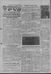 Пролетарии всех стран, соединяйтесь! KbUUeJcmuSmui Готовы к уборке трав Орган Карасукского райкома Коммунистической партии Советского Союза и районного Совета депутатов трудящихся Новосибирской области 73 (1947) | Воскресенье, 19 июня 1955 г. | Цена 15 к. Совещание работников сельского хозяйства Прибалтийских республик С 14 по 16 июня в Рпге проходило созванное по решению Центрального Комитета КПСС совещание работников сельского хозяйства Латвийской, Литовской и Эстонской ССР, посвященное задачам колхозов, МТС и совхозов Прибалтики но увеличению производства сельскохозяйственных продуктов. В совещании участвовали колхозники, работники МТС и совхозов, специалисты сельского хозяйства, ученые, руководители партийных и советских организаций Прибалтийских республик—всего свыше тысячи человек. Па совещании присутствовали также передовики сельского хозяйства Российской Федерации, Украинской, Белорусской и Карело- Финской ССР. В работе совещания принял участие первый секретарь ЦК КПСС товарищН. С. ХРУЩЕВ. С докладом о мероприятиях по организационно-хозяйственному укреплению колхозов, увеличениюпроизводствапсдачи государству сельскохозяйственных продуктов колхозами и совхозами п повышению оплаты трудодня колхозников Литовской, Латвийской и Эстонской ССР выступил заместитель председателя Совета Министров СССР тов. П. П. ЛОБАНОВ. В прениях подокладу т. Лобанова выступили секретарь ЦК КП Латвии т. КАЛНБЕР- ЗИН, секретарь ЦК КП Литвы т. СНЕЧКУС, секретарь ЦК КП Эстонии т. КЭБПН, председатель колхоза им. Ленина, Латвийской ССР, т. ОГРЕН, доярка колхоза «Рахва Выйт», Эстонской ССР, Герой Социалистического Труда Анни МПКО- МЯГИ,министр совхозов Эстонской ССР тов. МЕТТЕ и другие. 16 июня на совещании с большой речью выступил первый секретарь Центрального Комитета КПСС товарищ Н. С. ХРУЩЕВ, тепло встреченный всеми присутствующими. Участники совещания с большим подъемом принляи обращение ко всем колхозникам, колхозницам, работникам машинно-тракторных станций j и совхозов, специалистам сельского хозяйства Литовской, Латвийской и Эстонской ССР с призывом широко развернуть социалистическое соревнование за достижение в 1955 году решающих успехов в деле крутого подъема всех отраслей сельского хозяйства Прибалтийских союзных республик. (ТАСС). В совхозе «Октябрь» ведутся последние приготовления к сеноуборке. Уже скомплектовано пять тракторных сенокосильных агрегатов. С целью полной механизации сеноуборочных работ каждому сенокосильному агрегату придаются по одному стогометателю, сеноподборщику .и навесной волокуше. На днях сенокосильные агрегаты приступят к выборочнойуборке трав в низинных местах. II. Величко. Скирдуют прошлогоднее сено В колхозе имени Буденного в ближайшие дниначнется выборочная косовица трав. Одновременно с подготовкой к сенокосу, немалое внимание уделяется уборке остатков прошлогоднего сена. Этой важной работой сейчас заняты все полеводческие бригады колхоза. Уже заскирдовано более 2 тысяч центнеров сена, которое хорошо сохранило сво1 питательные качества. Ведется также скирдование прошлогодней соломы. Колхозники стремятся не оставить в поле ни одного клочка сена и соломы,.пригодного для скармливания скоту. А. Свиридов. На прорывке кукурузы Учащиеея Рассказовской семилетней школы дружно вышлина ирополку посевов 
