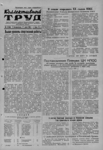 Пролетарии всех стран, соединяйтесь! 1CoUU£&nu£wui Т Р У Д Орган Карасукского райкома Коммунистической партии Советского Союза и районного Совета депутатов трудящихся Новосибирской области 85 (1960) | Воскресенье, 17 июл1я955 г. 1 Цена15 н. Вышеуровсепонрьтивнойработы Ежегодно советский народ отмечает Всесоюзный день физкультурника—праздник силы, здоровья и красоты замечательной советской молодежи. В этот день на улицы и стадионы городов и сел выходят десятки тысяч физкультурников. Они демонстрируют Коммунистической партии и Советскому правительству свои спортивные достижения, физическую закалку, готовность к труду и обороне своей Родины. Есть примеры хорошей физкультурной работы и в нашем районе. Неплохо поставлена спортивная работа в совхозах «Октябрь» и имени Дзержинского, в пункте «Заготзерно». Здесь но инициативе молодежи созданы футбольные и волейбольные команды, проводятся соревнования зимой по лыжам, летом по легкой атлетике. На полевом стане, рядом с тракторным вагончиком комсомольцы и молодежь первой полеводческой бригады колхоза имени Калинина оборудовали волейбольную площадку. Здесь же на берегу глубокого водоема они построилп небольшую вышку для прыжков в воду. К сожалению, таких примеров у нас мало. В целом по району в развитии физкультуры имеется много недостатков. Эта ответственная работа по воспитанию молодежи пущена на самотек. Члены районного комитета физкультуры и спорта не бывают в низовых физкультурных организациях, не оказывают им помощи в налаживании спортивной работы. По этой причине иногда хорошие начинания молодежи, не встретив поддержки, не доводятся до конца. Так, по инициативе комитета комсомольской организации (секретарь т. Геруцкий) при райпотребсоюзе был создан спортивный коллектив. Он развернул активную работу: был приобретен спортинвентарь, оборудована волейбольная площадка. Но на этом всё и остановилось. У комсомольцев не хватило ни знаний, ни навыков, чтобы интереснее организовать спортивную работу. Им нужна помощь, но ее никто не оказывает. Много молодежи работает на молочно-консервном заводе, в артели «Энергия», в промкомбинате. Но спорт здесь не в почете. Запущенность спортивной работы объясняется прежде всего тем, что этим делом не занимаются райком комсомола н его секретарь т. Завьялов. Райком не принимает никакого участия в организации спортивных соревнований, в развитии физкультурного движения. Здесь даже нет плана спортивной работы. Летние месяцы—самая благоприятная пора для увлекательных спортивных занятий, для нового подъема массовой физкультурной работы в городе и колхозном селе. Нужно в каждой бригаде, на каждой ферме создать спортивные коллективы, приобрести необходимый инвентарь. Необходимо больше проводить соревнований по футболу, волейболу, легкой атлетике, велосипеду, поднятию тяжестей, готовить спортсменов - разрядников, значкистов ПО . Почетной обязанностью районного комптета физкультуры и спорта, райкома ВЛКСМ п первичных организаций является всемерное развитие физкультурно-спортивной работы, воспитание молодежи здоровой, бодрой, жизнерадостной. Активно участвуя в крутом подъеме сельского хозяйства, физкультурники нашего района должны добиваться успехов в росте своих рядов, в совершенствовании спортивного мастерства. С В О Д К А о ходе заготовки ко