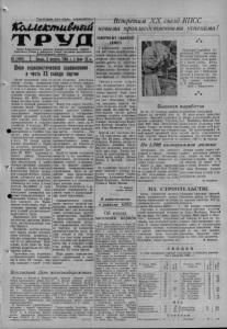 Пролетарии всех стран, соединяйтесь! ИЪмшсти&нпй Встретим X X съезд КПСС новыми производственными успехами! Т Р У Д Орган Карасукокого райкома Коммунистической партии Советского Союза и районного Совета депутатов трудящихся Новосибирской области 92(1967) | Среда, 3 августа 1955 г. I Цена 15 и. Шиер социалистическое соревнование в честь XX съезда парити Пятый пятилетний план по общему объёму промышленного производства выполнен за 4 года и 4 месяца. Эти успехи радуют каждого советского человека. Решения июльского Пленума ЦК КПСС вызвали новую могучую волну политической и трудовой активности советских людей. Трудящиеся единодушно одобряют и горячо поддерживают выработанную партией программу дальнейшего подъема всех отраслей промышленности и сельского хозяйства. В колхозах, МТС и совхозах, на транспорте, на ^предприятиях и стройках страны все шире развертывается социалистическое соревнование в честь XX съезда партии. Активно включились в борьбу за досрочное претворение в жизнь решений июльского Пленума ЦК КПСС труженики и нашего района. Коллектив мясокомбината пересмотрел свои обязательства и решил годовую программу завершить к 5 декабря— ко дню Советской Конституции. Широко развернув социалистическое соревнование, рабочие изо дня в день перекрывают нормы выработки, добиваются все новых и новых успехов. Партийная и профсоюзная организации здесь повседневно занимаются воп- осамп социалистического со- евнования, борются за широкую гласность его. Принимаются необходимые меры по созданию каждому рабочему всех условий для высокопроизводительного труда. Наращивают свои трудовые достижения работники райлес- хоза, железнодорожники станции Карасук. Коллектив молочно-консервного завода, изучив постановление Пленума, разработал и обсудил конкретные мероприятия по его выполнению. Необходимо, чтобы такие же мероприятия разработали все предприятия района. Труженики села, включаясь в социалистическое соревнование в честь XX съезда партии, заявляют о своей готовности обеспечить животноводству сытую и теплую зимовку, во-время и без потерь убрать урожай, в срок рассчитаться с государством по обязательным поставкам и закупкам сельскохозяйственных продуктов. Между тем следует отметить, что еще не все предприятия района работают ритмично, •справляются с государственным планом. Например, промкомбинат полугодовой план выполнил всего лишь на 80 процентов. Значительно отстает за последнее время промысловая артель «Энергия». Эти предприятия не придают большого значения выполнению производственного плана в ассортименте, не борются за качество вырабатываемых изделий. Одной из причин отставания является то, что партийные и профсоюзные организации не вникают глубоко в производство, не придают должного значения социалистическому соревнованию. Здесь не все рабочие ясно представляют какие задачи стоят перед предприятием и в отдельности перед каждым цехом. Большим недостатком в руководстве соревнованием является отрыв от распространения опыта передовиков. Социалистическое соревнование— могучее средство пробуждения активности и инициативы масс для выполнения задач, поставленных партией и правительством. Партийные и профсоюзные организации обязаны повседневно руководить соревнованием, настойчиво бороться за повышение производи