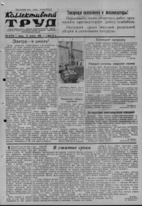 Пролетарии всех стран, соединяйтесь! KhUJjtScmuitmd т р у д Орган Караеукского райкома Коммунистической партии Советского Союза и районного Совета депутатов трудящихся Новосибирской области 104 (1979) I Сведа. 31 августа 1955 г. i Цнеа1.5А . Завтра— в школу! Завтра начинается новый учебный год. Снова радостно распахнутся двери советских школ, весело зазвенят звонки, извещая о начале учебного года. Отдохнувшие п окрепшие в пионерских лагерях, на нолях колхозов и совхозов, в путешествиях и походах, ребята вновь войдут в светлые, еще пахнущие свежей краской комнаты. Руководители школ, общественность позаботились о том, чтобы все было готово к началу учебного года. В школах проведен капитальный и текущий ремонт помещений, заготовлено тоилпво, п о п о л н и л и с ь учебными пособиями физические и химические кабинеты. С каждым годом в районе расширяется сеть общеобразовательных школ. В нынешнем году их будет девяносто. Две семилетиях школы преобразованы в средние—одна из них (Карасартовская) на казахском языке. • В Черной Курье открывается-вечерняя средняя школа сельской молодежи. Значительно увеличивается количество учащихся старших классов. Если в 1951 году в 8—10 классах обучалось 137 человек, то в 1955 г. в школу придет свыше 800 человек. Только в однпх 10 классах нынче будет занижаться учащихся более, чем четыре года назад во всех старших классах. Коллектив учителей пополнился новыми теоретически подготовленными педагогическими кадрами. В школы района приехали молодые учителя-выпускники Чкаловско- го н Новозыбковского пединститутов, Московского и Казанского госуниверсптетов и других вузов страны. В школах идут последние приготовления: проверяют есть ли мел, хватает ли тетрадей нужной разлиновки, все ли обеспечены учебниками, еще раз уточняют списки учащихся. К началу занятий должно быть готово все до мелочей. Большие задачи стоят сейчас перед учащимися. На заботу Родины, щедро отпускающей средства на образование молодого поколения, они должны ответить напряженным, плодотворным трудом, настойчиво и пытливо проникать и овладевать знаниями. В нынешнем учебном году в школах для этого будет создано больше условий. Учеба приближается к производству. В новых программах и учебниках, по которым будут проводиться занятия, большое внимание уделяется ручному труду, практикумам но сельскому хозяйству, экскурсиям на производство. Со старшеклассниками предусмотрено изучение автомобиля, трактора, основ электротехники и сельского хозяйства. Новые задачи, поставленные перед школой, налагают еще большую ответственность за обучение и воспитание детей на учительские коллективы. Они д о л ж н ы смелее внедрять в учебно-воспитательной работе новые программы, умело сочетать теоретические уроки с практикумами. Завтра—в школу! В новый, большой, неизведанный путь поведут учителя своих воспитанников. Всего доброго на этой тернистой, но благородной дороге к знаниям! Товарищиколхозникии механизаторы! Наращивайте темпы уборочных работ, организуйте круглосуточную работу комбайнов. Наступили сроки массовой раздельной уборки и силосования кукурузы. Завершают уборку зерновых Большинство ферм совхоза имени Дзержинского уже завершили косовицу хлебов. Всего по совхозу скошено около 3,5 тысячи гектаров зерновых. Стремясь встретить ХХ-й съезд КПСС достойными трудовым
