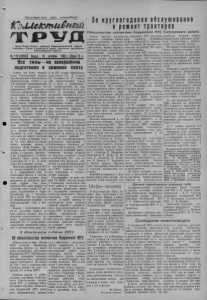 Пролетарии всех стран, соединяйтесь! &сы1Ле4сти&н£1й Т Р У Д Орган Карасувского райкома Коммунистической партии Советского Союза и районного Совета депутатов трудящихся Новосибирской области № 125 (2000)1 Среда, 19 октября 1955 г. 1Цена15 к, Все силы— на завершение подготовки к зимовке скота Сейчас нет более важной, более ответственной задачи, чем обеспечение общественного животноводства теплой и сытой зимовкой. Заканчивающийся месячник показывает, что руководители МТС, колхозов и совхозов, первичные партийные организации и сельские Советы не приняли необходимых мер по усилению темпов заготовки кормов, строительства и ремонта животноводческих помещений. За 25 дней месячника увеличение кормов в районе составило только 4 процента. Ряд колхозов в это время совершенно прекратили косовпцу и скирдовку сена, не вели закладку силоса, не нодвозили заготовленные корма к фермам. Колхоз имени Тельмана за этот период не заготовил ни одного центнера сена н подвез к фермам только 66 тонн. Почти не увеличились кормовые запасы в колхозах «Маяк Ильича», им. Андреева, им. Сталина, им. Молотова, в совхозах «Октябрь» и им. Дзержинского. А обеспеченность скота сеном здесь составляет от 6 до 13 центнеров на условную голову. Некоторые руководители МТС не довели заданий по косовице н скирдованию сена до тракторных бригад, в результате почти воя техника была выключена пз работы по заготовке кормов. Так, Хоро- шинская МТС дала прирост по заготовке сена только 0,6 процента, Студеновская и Черно- курьпнская— по 3 процента. Ни в одной МТС не доведены до механизаторов задания по транспортировке сена к фермам. Наряду с ослаблением работы по заготовке кормов не было принято нужных мер по усилению строительства и ремонта животноводческих помещений. Пз 77 новых животноводческих помещений закончено строительством лпшь 12, а из 292 старых отремонтировано только 194. В колхозе им. Тельмана пз 19 помещений отремонтировано только 11, в «Путь к коммунизму» не отремонтировано ни одно помещение. Почти во всех колхозах не завершены работы по ремонту имеющихся и установке новых кормозапарников, кормокухонь и траншей для запаривания кормов, электродоильных аппаратов, автопоилок, подвесных дорожек. В ряде колхозов не решены вопросы водоснабжения, приготовления кормов. В МТС, совхозах и колхозах j до сих пор не составлены планы по проведению зпмовки скота, расстановке кадров, использованию техники и механизаторов на работах на фермах в период зимовки. Все эти недостатки явились результатом благодушия и успокоенности отдельных руководителей колхозов, МТС и совхозов за состояние животноводства, которые во-время не получили должного отпора и разоблачения. Все эти недостатки есть результат снижения уровня организаторской и массово-политической работы в МТС, колхозах, совхозах, тракторных и полевод - ческих бригадах. Состоявшийся на днях пленум РК КПСС обсудил вопрос о готовности колхозов и совхозов района к зимовке скота и наметил конкретные меры по устранению имеющихся в этом деле недостатков. Пленум определил, что подготовка теплой и сытой зимовки общественному скоту является главной задачей в данный период. Долг руководителей колхозов, МТС п совхозов, партийных организаций, всех тружеников села— направить все силы на практическое выполнение решения пленума, на создание скоту т