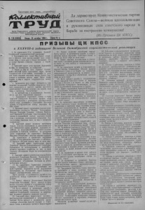 2. КОЛЛЕКТИВНЫЙ ТРУД 26 октября 1955 года, № 128 П Р И ЗЫВЫ ЦК КПСС к X X X V I I l -й годовщине Великой Октябрьской социалистической революции (Окончание ) 41. Рабочие и работницы, инженеры и техники промышленности товаров широкого потребления! Расширяйте производство и ассортимент товаров, экономнее используйте сырье! Больше добротных и красивых тканей, хорошей одежды, прочной и изящной обуви и других товаров народного потребления! 42. Работники промышленности продовольственных товаров, мясных и молочных продуктов! Всемерно расширяйте производство продуктов питания, улучшайте их качество и снижайте себестоимость! Больше сахара, жиров, мясных, молочных и других продуктов для населения! 43. Работники рыбной промышленности! Добивайтесь выполнения плана лова и обработки рыбы! Лучше используйте промысловый флот и орудия лова! Развивайте рыбоводство, повышайте качество и снижайте себестоимость продукции! 44. Колхозники и колхозницы, работники МТС и совхозов, специалисты сельского хозяйства! Расширяйте посевные площади, повышайте культуру земледелия, добивайтесь высоких урожаев! Боритесь за дальнейшее освоение целинных и залежных земель! Добьемся ежегодного сбора зерна не менее 10 миллиардов пудов! 45. Колхозники и колхозницы, работники МТС и совхозов! Всемерно расширяйте посевы и повышайте урожайность кукурузы--важнейшего источника резкого увеличения производства зерна и создания прочной кормовой базы для животноводства! 46. Работники сельского хозяйства! Боритесь за мощный подъем всех отраслей социалистического сельскохозяйственного производства! Лучше используйте земельные угодья и имеющиеся резервы в колхозах и совхозах! Дадим стране больше зерна, мяса, молока, шерсти и других сельскохозяйственных продуктов! 47. Колхозники и колхозницы, рабочие и работницы МТС и совхозов, специалисты сельского хозяйства! Настойчино боритесь за полное использование техники, за внедрение комплексной механизации во все отрасли сельского хозяйства! 48. Колхозники и колхозницы! Повышайте производительность труда и укрепляйте трудовую дисциплину! Изучайте и широко внедряйте в производство достижения науки и передового опыта! Обеспечим дальнейшее укрепление и всемерное развитие общественного хозяйства колхозов, рост колхозных доходов и повышение благосостояния колхозников! 49. Работники сельского хозяйства! Добивайтесь резкого повышения продуктивности и увеличения поголовья скота! Обеспечим хорошую зимовку скота! Дадим стране больше продуктов животноводства! 50. Колхозники и колхозницы, работники МТС и совхозов! Расширяйте производство хлопка, льна, сахарной свеклы и других технических культур, овощей и картофеля! Добивайтесь повышения урожайности этих культур! 51. Работники машинно-тракторных станций! Боритесь за повышение урожайности всех сельскохозяйственных культур и продуктивности животноводства, за развитие общественного хозяйства колхозов, за своевременное выполнение колхозами обязательств перед государством по сдаче сельскохозяйственной продукции! Обеспечим высококачественный ремонт тракторов, комбайнов и других машин! 52. Работники совхозов! Лучше используйте земельные угодья, повышайте урожайность полей и продуктивность животноводства! Создавайте собственную кормовую базу в совхозах! Улучшайте организацию производства