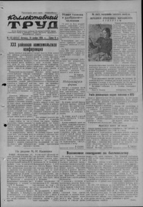 Пролетарии всех стран, соединяйтесь! Gi h lu e fc m 4s£H $ u .i Орган Карасукского райкома Коммунистической партии Советского Союза п районного Совета депутатов трудящихся Новосибирской области № 137 (2012)1 Пятница, 18 ноября 1955 г. I Цена 15 к. XXX районная комсомольская конференция Завтра начинает свою работу XXX районная комсомольская конференция. Это — большое событие в жизни комсомольцев и молодежи района. Конференция подведет итоги пройденного пути за год, вскроет ошибки и недостатки в работе, наметит меры по их устранению. Конференции предшествовали отчетно-выборные собрания в первичных комсомольских организациях. На них члены ВЛКСМ на основе критики и самокритики оценили работу комитетов и секретарей комсомольских организаций, отметили недостатки руководства со стороны районного комитета комсомола п отдельных его работников. Делегатов, избранных на районную конференцию, комсомольцы облекли высоким доверием и большими правами. Их долг—умело исиользовать эти права и оправдать доверие. Обобщив критические выступления комсомольцев, делегаты должны в полный голос с трибуны конференции заявить о тех ошибках и недостатках, которые имела место в работе. На чем следует остановиться в первую очередь, на чем сосредоточить главное внимание? Комсомольская работа — это работа с людьми. Задача комсомола—сплачивать, растить, закалять молодежь, выводить ее на широкую дорогу жизни. Стадо быть, речь должна идти прежде всего о том, как воспитывалась молодежь, как - влияли комсомольские дела на юношей о девушек, помогали им стать в ряды поборников всего нового, передового. Следует сказать и том. почему некоторые комсомольцы опаздывают на работу, прогуливают, не участвуют в жизни своих организаций, почему еще в среде молодежи бывают случаи пьянства, хулиганства, аморального поведения? Обо всем этом нужно сказать и сказать во весь голос. Комсомол всегда являлся активным участником всех событий, происходящих в стране. На конференции нужно рассказать о трудовых делах комсомольцев и молодежи района, какое они принимают участие в претворении в жизнь исторических решений !партии и правительства по дальнейшему подъему сельского хозяйства и промышленности, какой вносят вклад в борьбу за достойную встречу XX съезда КПСС. Особое внимание следует уделить вопросу о том, как молодежь учится в вечерних школах, кружках и политшколах комсомольского политпросвещения, какое участие принимает в оборонно-спортивной и культурно-массовой работе. Чем активнее делегаты примут участие в обсуждении отчета, чем строже иодойдут к оценке работы, тем больше будет пользы для дела. Голос деловой, прпнцпппальной критики должен громко звучать на конференции. По-деловому должны подойти делегаты к избранию нового состава райкома. Эту высокую честь следует отдать лучшим из лучших активистов, заслужившим это доверие своими практическими делами. Новая техника и удобрения— колхозам На днях на базу межрайонного отделения „Сель- хозснаба“ поступила большая партия зернопультов и зернопогрузчиков. Эти машины значительно облегчают труд колхозников при подработке и погрузке зерна. В ближайшие дни ожидается прибытие кормозапарников емкостью в одну тонну. На базу также поступило около 200 тонн минеральных удобрений. Среди них суперфосфат и сульфат аммония. Сейчас в колхозах ра