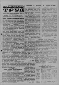 декабря 1955 года, № 148 КОЛЛЕКТИВНЫЙ ТРУД 3. ТЕйсьма в р е д а к ц и и Забота о переселенцах Добросовестно трудятся кол-1 хозппки-переселепцы в сельхозартели «Жол Сталина». Так, Забира Халимова летом работала поваром на полевом ста 1 \ сейчас—на животноводческой ферме дояркой. Недавно молодую колхозницу приняли в членыВЛКСМ. Вместе с Халимовой приехала в колхоз Анида Ямалит- дннова. Сейчас она тоже трудится на ферме. Заведующий феромй часто ставит доярок- нереселенок в пример другим. Б, -т Аниды—Мисфах—лучший шофер колхоза. Он добросовестно выполняет любые поручения. Заслуженным уважением пользуются отец и сын Кама- литдиновы. Летом онипомогли колхозу в ремонте истроительстве животноводческих помещений, осенью отремонтировали колхозную механическую мельницу и сельхозмашины. Правление артели «Жол Сталина» проявляет заботу о быте переселенцев и обзаведени ими личнымхозяйством. Так, каждой из трех приехавших семей колхоз выделил по одной корове, обеспечил пх сеном. Е. Рыспаев, секретарь комсомольской организации колхоза „Жол Сталина". Вместо дела пгсчой нынешнего года коллектив пункта «Заготзерно» взял шефство над нашим колхозом. Шефы выяснили нужды артели и обещали оказать помощь в строительстве животноводческих помещений. —Мывампокроем строящийся свинарник, изготовим нужное'' количество оконных и дверных коробок, оконных переплетов и дверей,—заверил директор пункта «Заготзерно» т. Лысенко. Прошел месяц. Мы обратились к т. Лысенко с просьбой поторопиться с помощью. —Указания даны, заказ на плотницкие работы выполняется,—заявил т.Лысенко,— все будет готово к 10 августа. ii зтему же времени покроем '■вианрник. Прошло 10августа. —Заказ еще не готов, а —обещания свинарник крыть начнем 20 августа,—ответил нам т. Лысенко. Наконец, 1 сентября получили оконные коробки, но в меньшем количестве, чем заказывали, и плохого качества. Остальной же заказ до сих пор не выполнен. Еще пять раз т. Лысенко откладывал начало работ на свинарнике. И только 10 ноября приехали шефы, кое-как, не заботясь о качестве, накрыли 70 процентов крыши уехали. В результате недобросовестного отношения директора пункта «Заготзерно» т. Лысенко к оказанию шефской помощи в колхозе оказались недостроенными свинарник и коровник, и скот, размещен плохо. И. Давиденко, заместитель председателя колхоза „Новая семья". Письма доставляют не поадресу Мы жпвем в Калиновском сельсовете на участке «Загот- скота», всего в 35 километрах ог Карасука. А почта из Ка- расука к нам идет по несколько дней, иногда и по месяцу. Дело в том, что адресованные нам письма почтовые работники направляют почему-то в контору «Заготскота», которая находится в городе. Цлежат они там, пока не иопадется попутчик. Абывает и теряются. Рабочие участие „Загогскот*- Деревенская новь (Письмо из ГДР) Вся послевоенная жизнь восточногерманской деревни носит на себе отпечаток проведенной десять лет назад земельной реформы. Эта реформа исправила вековую несправедливость, передав землю в туки тех, рто должен вла деть ею чо праву. О новой жизни деревни Гер" ’ •некой Демократической Республики красноречиво говорят цифры, опубликованные в немецкий демократической печати в свг~и с годовщиной земельной реф. рмы. По закону о земельной реформе из трех с лишним миллионов гектаров земельных владений помещиков, военных п