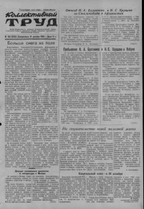 Пролетарии *хех стран, соединяйтесь! 1СЬиае&ГШбН6Ш. Орган Кярасунекого райкома Коммунистической партии Советского Союза и районного Совета депутатов трудящихся Новосибирской области №150(2025)}Воскресенье, 18 декабря1855 г. (Цена15 к. Больше снега на поля Отъезд И. А. Булганина и N. С. Хрущева из Сталинабада в Афганистан Как уже сообщалось, самолет, на котором вылетели из столбцы Индии города Дели в Афганистан Председатель Совета Министров СССР Н. А. Булганин и Член Президиума Верховного Совета СССР Н. С. Хрущев, ввиду сложных метеорологических условий в районе Кабула, совершил посадку в этот день в Сталинабаде. На протяжении всего пути от аэродрома до города Н. А. Булганина и Н. С. Хрущева горячо приветствовали тысячи трудящихся Сталинабада. Вечером 14 декабря Н. А. Булганин и Н. С. Хрущев присутствовали в Таджикском государственном театре оперы и балета имени С. Айни на большом *концерте. 15 декабря Председатеь Совета Министров СССР Н. А. Булганин и Член Президиума Верховного Совета СССР Н. С. Хрущев и сопровождающие их генерал армии И. А. Серов, первый заместитель министра иностранных дел СССР А. А. Громыко, заместитель министра внешней торговли СССР П. Н. Кумыкин вылетели из Сталинабада в Кабул. (ТАСС). Искусственное задержание снега на полях стало одним из надежных средств повышения урожайности сельскохозяйст венных культур. Нынешней осенью в районе выпало очень мало осадков в виде дождя, и к моменту замерзания почвы продуктивная влага в пахотном горизонте составляла всего 19—24 процента. Такого количества влаги недостаточно для нормального прорастания семян. Весеннее увлажнение пахотного слоя должно составлять не менее 50— 60 процентов. Только в таких условиях семена своевременно и дружно прорастают. Вот почему нынешней зимой необходимо проявить максимум заботы, чтобы всеми доступными средствами соЗ' дать хороший снежный покров на полях. Именно так поняли свою задачу члены артелп «Вперед к коммунизму». Здесь снег задерживается тракторными снегопахами, снопамп камыша, используются также в качестве снегозадерживающих преград щиты и навозные плиты, делаются вручную валы из снега. Снегозадержание преследует целью не только накопление влаги в почве. Снежный покров предохраняет землю от глубокого промерзания и таким образом способствует более раннему созреванию почвы для ее предпосевной обработки и посева. При наличии толстого снежного покрова весеннее таяние проходит постепенно, талые воды хорошо и полностью поглощаются почвой, а не стекают померзлой поверхности в низины и овраги. За последнюю декаду ноября и первую декаду декабря выпало осадков в виде снега в переводе на воду 22,3 мм. Это редкий год в условиях Ка- расукского района по обилию снега в этом периоде. Казалось бы, руководители МТС, колхозов п совхозов должны были мобилизовать все силы и средства для максимального накопления снега на полях. Однако этому важному агротехническому мероприятию не придают должного значения. В Карасукской МТС, например, не занимаются снегозадержанием в колхозах им. Тельмана, «Жол Сталина» и других. Безответственность к проведению зимних мероприятий проявляют директор Студеновской МТС т. Козлов и главный агроном т. Хачко. Они стараются найти различные причины, только бы не начинать снегозадержание. В стороне от накопления снега на полях стоят