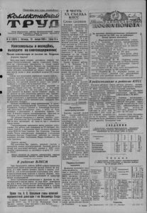Пролетарии всех стран, соединяйтесь! jC b U a e fcm u & m ^ Орган Кярасуксвого райкома Коммунистической партии Советского Союза и районного Совета депутатов трудящихся Новосибирской области № 6 (2037) | Пятница, 13 января 1956 г. |! Цена 15 к. Комсомольцы и молодёжь, выходите на снегозадержание! Письмо комсомольцев из колхоза им. Андреева Дорогие друзья! Весь наш народ готовит достойную встречу XX съезду Коммунистической нартии Советского Союза. Этим же стремлением проникнуты и члены нашей сельхозартели им. Андреева. Недавно мы, комсомольцы пятой полеводческой бригады, пришли на собрание, чтобы обсудить волнующий нас вопрос—какой мы можем внести вклад в дело достойной встречи XX съезда партии? Сейчас для тружеников деревнинет важнее задачи— успешно провести зимовку скота, заложить прочную ос нову для получения высокого урожая в будущем году. Известно, что высокий урожай не придет сам собой и особенно в условиях Кулундинской степи. Советские люди научились не ждать милостей от природы. Партия учит нас, что взять их у нее—наша задача. У каждого из нас есть свой участок работы: одни трудятся на фермах, другие подвозят корма, но мы решили за счет уплотнения рабочего дня, повышения производительности труда найги время для того, чтобы участвовать в проведении зимних агромероприятий и изготовить триста навозных плит, задержать снег на двухстах гектарах. Активно включились наши комсомольцы а проведение зимних агромероприятий. Телятницы Александра Курашкина, Надежда Савенко и Александра Вахтерова уже изготовили 90 навозных плит, а всего на поля вывезено и расставлено в шахматном порядке 150 плит. В первую очередь агромероприятия проводим на участках, где будут размещены посевы кукурузы. Не забывает молодежь и о вывозке местных удобрений. Комсомольцы Зоя Куцепова и Владимир Чернобай за день доставляют на поля по три с половиной тонны навоза. Снегозадержание проводится двумя конными снегопахами. Эта работа уже завершена на 75 гектарах. Активное участие в накоплении влаги на полях принимают члены ВЛКСМ Иван Савенко, Зоя Куцепова, Надежда Дзюба. Почин комсомольцев поддержала и несоюзная молодежь бригады. Старательно работают на снегозадержании молодые колхозники Мария Агейкина и Леонид Брендель. Дорогие друзья! Мы призываем Вас принять активное участие в проведении зимних агромероприятий. Заложим прочную основу для получения высокого урожая в 1956 году! Давайте соревноваться за достойную встречу XX съезда КПСС! Письмо обсуждено на открытом комсомольском собрании пятой полеводческой бригады колхоза имени Андреева. В райкоме ВЛКСМ БюроКарасукского райкома ВЛКСМодобрило инициативу комсомольцев пятой полеводческой бригады колхоза им.Андреева, рел шлих принять активное участие в вывозке удобрений на ..оля иснегозадержании ипредложило всем комсомольским организациям колхозов и совхозов обсудить письмо комсомольцев и включиться в соревнование за проведение зимних агромероприятпй. Итоги соревнования комсомольцев и молодежи на снегозадержании и вывозке навоза на поля будут подводиться два раза в месяц. Лучшие молодые производственники будут награждены почетными грамотами обкома ВЛКСМ и ценными подарками, а также похвальными листами райкома ВЛКМС. Прием тов. Н. С. Хрущевым главы иранской парламентской делегации г-на Мохаммеда Саеда 11 января 
