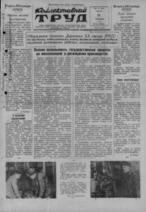 ВнестьXX съезда КПСС ыие молот сударству 'шно потрудились работ- Карасукского маслоза- 1955 году. Они выпол- довой план заготовки по индиви- му сектору на ентов. Лучших результатов добились заведующие молоко- приевдЖ1х пунктов пос. Алекщщровки и По- х крЪвкгктт. Обухова и е г о Щ з . не меньшим напряжением Щы ^удятся они и сейчас, шись в социалистичес- ревнсвание за достой- речу X I съезда КПСС ясь внести свой вклад лнение грандиозного намеченного в проекте в XX съезда КПСС но пягилетнему плану, ки маслозавода берут ..„„..^нные трудовые обяза- $|~^елыж!а. Тов. Обухова из по- Александрова обяза- о^а&мщ готовить в 1956 году птЪ^ пого индивидуального •^хозяйства не менее чем по 1 ^ 1.100 литров молока, заведующая молокоприемным пунктом поселка Жестолап т. Дмитриева—по 1.000 литров от каждого хозяйства, заведующая \ Щшжоприемным пунктом в го- ^О] Пролетарии всех стран, соединяйтесь! iC b JU e k u n u S H S U t, Т Р У Д Орган Квраеукского райкома Коммунистической партии Советского Союза и районного Совета депутатов трудящихся _______Новосибирской области 1956 Я . 1956 ЯНВАРЬ 27 Пятница № 12 (2043) Цена 15 коп. Обсуждение проекта Директив XX съезда КПСС по шестому пятилетнему плану вызвало мощный подъем трудовой активности рабочих, колхозников, служащих ое ную и ст В В1 3 план ' Ж ^ в р е | шее 1 1’аб П0В1 ьс Полнее использовать государственные кредиты на механизацию и расширение производства - Д)оде Карасуке т. Чумакова обязалась заготовить не менее 250 центнеров молока. По примеру передовых тружеников в соревнование в честь XX съезда КПСС включились v все работники маслозавода и ' взяли на себя повышенные обязательства. В. Хоменко. С высокими показателями С высокими трудовыми показателями идут навстречу XX съезду КПСС механизаторы тракторной бригады коммуниста т. Обухова ив Карасук- ской МТС, работающие в сельхозартели «Маяк Ильича». Они ежедневно подвозят к местам зимовки скота по 120 центнеров грубых кормов, задержали снег на площади 800 гектаров и вывезли на поля 300 тонн навоза. На снегозадержании хорошо трудится тракторист Роман Шнайдер, на подвозке кормов добросовестно поработали трактористы Михаил Буров и Николай Коротков, Проект Директив XX съезда КПСС по шестому пятилетнему плану развития народного хозяйства ставит главными задачами, чтобы на базе преимущественного развития тяжелой промышленности, непрерывного технического прогресса и повышения производительности труда обеспечить дальнейший мощный рост всех отраслей народного хозяйства, осуществлять крутой подъем сельскохозяйственного производства и на этой основе добиться значительного повышения материального благосостояния и культурного уровня советского народа. Большая роль в успешном решении этих задач отводится делу максимальной механизации производства и расширению ассортимента выпускаемой продукции. Правительство, учитывая нужды производства, разрешило Государственному банку выдавать предприятиям и организациям кредит на механизацию и расширение производства на льготных условиях. Если обычный банковский кредит выдавался на срок не более одного года, то кредит на механизацию и расширение производства выдается сроком до двух лет. Руководитель предприятия самостоятельно утверждает все сметно-финансовые расчеты для представления их Государственному банку. ; В целях более быстрого разрешения вопросов, с