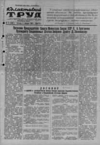 u / v % t M M ' w A Пролетарии всех стран, соединяйтесь! iO >Ju ekm u £H su i i ]?*РасУкског» райкома Коммунистической партии «светского Сои,за »■ райсвио.о Совета д/иутатов трудящихся __________ Вовосвбврсьой области № |5 (2046) | Пятница, 3 февраля 1856 г. 1!Цена 15 к. Улучшение советско-американских отношений облегчило бы задачу прекращения гонки вооружений и способствовало бы более полному использованию экономических ресурсов государств в мирных интересах. (Из Послания Н. А. Булганина Дуайту Д . Эйзенхауэру). ПослнаиеПредседателя Совета Министров Союза ССР Н. А. Булганина Президенту Соединенных ШтатовАмерики Дуайту Д. Эйзенхаузру • ^ января Чрезвычайный иI жественное сотрудничество Полномочный Посол СССР в[основанное на стремлении к США 1 . Н. Зарубин посетил взаимопониманию, взаимном Президента Соединенных Штатов Америки Дуайта Д. Эйзенхауэра и вручил ему Послание Председателя Совета Ми нистров СоюзазССР Н. А. Булганина. Ниже публикуется текст указанного Послания: „МОСКВА, КРЕМЛЬ 23 января 1956 года. Уважаемый господин Президент, Будучи глубоко убежденным в том, что Вы разделяете испытываемую мною озабоченность нынешним состоянием отношений между нашими странами, я хотел бы поделиться с Вами своими соображениями о возможных путях улучшения этих отношений, Вы, конечно, согласитесь со мною, что сложившееся ныне международное положение требует от всех государств, и в первую очередь от великих держав, несущих особую ответственность за обеспечение всеобщего мира и безопасности народов, принятия мер, могущих способствовать дальнейшему ослаблению международной напряженности, укреплению доверия и сотрудничества между государствами. Это отвечало бы горячему стремлению народов жить в мире и спокойствии, посвятить свои материальные ресурсы и энергию творческому созидательному труду, культурному подъему и процветанию. В Женеве на совещании Глав Правительств четырех держав мы все заявили о нашей го товности добиваться уменьшения международной напряженности и улучшения отношений между государствами в соответствии с принципами мирного сосуществования и делового сотрудничества. Несомненно, что особое значение для дальнейшего уменьшения международной напряженности имеет вопрос об отношениях между Советским Союзом и Соединенными Штатами Америки. В этой связи возникает вопрос о необходимости предпринять шаги, направленные на существенное улучшение отношений между Союзом Советских Социалистических Республик и Соединенными Штатами Америки. Такое улучшение советско-американских отношений было бы серьезным вкладом в дело оздоровления всей международной обстановки, в дело поддержания и укрепления всеобщего мира. История отношений между нашими странами убедительно свидетельствует, что их друуважении суверенитета, а в дальнейшем и на совместной борьбе против сил агрессии, отвечает высшим интересам народов обеих стран. Нельзя признать случайным, что, за исключением периода иностранной интервенции против молодой Советской Республики, народы наших государств никогда не воевали друг против друга, между ними не было и нет каких-либо непримиримых разногласий, не имеется границ или террито- которые могли бы стать предметом спора или конфликта. Поэтому с чувством полного понимания было встречено советским народом Ваше заявление на совещании Глав 