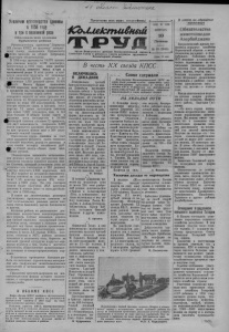 10 февраля 1956 года, № 18 КОЛЛЕКТИВНЫЙ ТРУД 3. ,П11Сьма в редакцию Досрочно рассчитываются с государством cK^oTr L i f n rOJiaTCK0-0 сель*1 колхоза- им. Тельмана Д. Ми ^ а "!!?“0ДГ1Т б0льшУю Iхсов- К. Кип ГКО и некиторы Актив Благодатского сель-i кого Совета проводит большую разъяснительную работу среди населения по досрочной уплате сельскохозяйственного налога. Их разъяснения находят У колхозников горячий отклик. ее , Н. гко другие уже полностью рассчп тались с государством но сельхозналогу. Приступила :с уплате подоМ. Пщенво. J ----- -- UTKJlIlii. • - - ------------ Члены сельхозартели «Вперед хпдного налога сельхозартель к коммунизму» Н. Власова, I <<ВиеРед к коммунизму», Г. Агеев, А. Морозова, члены! м п_ Школьный лекторий ,, , п партийная орга-1 метила серьезш низания ларасукской средней Iсемьи и школы т к в п и пл и..........___ Зановую встречу в Кремле Дирекция и партийная ные недостатки Зи средн i в воспитании у °° ШШ11иапше роди- детей скромности, вежливости тульского комитета опганизп- и шмшпипптп „..о р зовали ири школе лекторий для родителей. В план работы его включили проведение лекций на иедагогическпе, политические, научно популярные и другие темы. Для чтения лекций привлечены учптеля, врачи, партийные и советские работники. 30 января преподавателем математики Р. Новиковой была прочитана лекция «О воспитании в Семье навыков культурного поведении». Эту лекцию и правдивости. Нередко учащиеся, особенно пятых и шестых классов, не умеют тактично вести себя на улице, в общественных местах, громко смеются, кричат, не хотят извиниться, если причинят кому- нибудь неприятность, поют неснп там, где это неположе- ио. Родители предложили проводить с учащимися классные часы на тему: «Воспитание скромности и вежливости». 6 февраля дишма-е.знакомил .ЩШклей с проектом Директив ^мШ.ш^г?еепВ» Са^ " ийь1 Сказы-1 ЦК КПСС по шестому пятилет “ "IDS отношение к ней,(нему идану развития народнозадавалп много вопросов, вносили предложения по дальией шей работе лектория. Родительница т. Седых от го хозяйства СССР. В следующий раз намечено провести беседу «Советы врача». С. Митрофанов. Улучшают работу ДОСДЯФ Плохо проводила оборонно- тт. Марченко, Семин и другие массовую работу первичная организпппя ДОСААФ ст. Карнсу к. Здесь не было организовано нп оборонных кружков, ни спортивных секций. Недавно на собрании члены ДОСААФ иодверглп резкой критике за бездеятельность комитет ДОСААФ и его председателя т. Хорошаева. В своих выступлениях коммунисты не только указывали на недо статки в работе, но и на пути устранения этих недостатков. Первичная организация решила создать два кружка: стрелковый и связи. На этом же собрании приняли в члены ДОСААФ 15 человек. А. Дерипаске, инструктор РК ДОСААФ. От всего сердца Почетна и ответственна профессия врача. Немало порой приходится преодолеть трудностей и потратить сил, чтобы отстоять еще одну жизнь, вернуть в строй еще одного труженика. Большой любовью и уважением платят за эти труды благодарные пациенты. Тяжело заболела член сельхозартели «Маяк Пльнча» А. Павлова. Но благодаря чуткому и j мелому лечению врача JI. Потемкиной и обслуживаю щего персонала она поборола благодарит А. Павлова кол лектив медпцпнскпх работни ков тубдиспансера и его руко водителя Л'Ниславу Стеианов ну Потемкину. Около трех недель пролежала в районной больнице ж и тельница города Карасука Е. Мо
