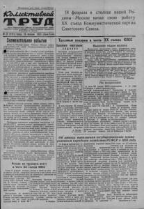 Пролетвуии всех стран. г с гц н н яй т тА 1CbUJ£kxnu£usiu 0|>1ян Карагукгкого ' райвока Коммунвствчеекой партии Советского Союза и райониою Совета депутатов трудящихся Новосибирской области Ws 20 (2C5DJ Среда, 15 февраля 1956 г.|Цена1Ь коп 14 февраля в столице нашей Родины—Москве начал свою работу XX съезд Коммунистической партии Советского Союза. Знаменательное событие Трудовые подарки в честь XX съезда КПСС Вчера в столице нашей Родины—Москве начал свою работу X X съезд коммунистической, партии Советского Союза. ■Р В предсъездовские дни с особой силой продемон- 'стрир шились единство партии и народа, безграничная любовь и преданность советских людей к Коммунистической партии—всохнсвителю и организатору всех наших побед. Развернувшееся в стране всенародное социалистическое соревнование в честь X X съезда КПСС еще и еще раз выражает тот знаменательный факт, что планы Коммунистической партии претв(!ряются в жизнь вдохновенным трудом миллионов, что великое дело партии—это родное, кровное дело всего народа. Активное участие в предсъездовском трудовом соревновании приняли и трудящиеся нашего района. M l С, колхозы и совхозы района, выполняя исторические постановления партии по подъему сельского хозяйства, активно готовятся к весне, к получению в 1956 году высокого урожая всех культур. Успешно справились с предсъездовскими обязательствами коллективы механизаторов Карасукской, Черно- ку/ы/некой и Октябрьской МТС. День открытия съезда они встречают полным завершением годового 4 ш на ремонта тракторов. В колхозах им. Джам- оуПа, им. Амангельды, им. Куйбышева успешно идет задерж ание снега на полях , в колхозах им. Тельмана, яМаяк Ильича", жЖ ол Сталина", шВперед к номму низму "—вывозка на воза. Многие колхозы успешно ведут зимовку скота, Фобиьаясь высокой продуктивности животных. В этом omHcutenuu гона: отелен пример колхоза им. Дзержипского. Животноводы этой артели ко дню открытия съезда надоили более чем по 310 литров молока на кажоую фуражную корову. Здесь только за первою декаду февраля надоено в среднем на корову по 42,2 литра. Увеличились надои в колхозах шПуть к коммунизму* и шМаяк Ильича". Трудовыми подарками встречают открытие X X съезда КПСС промышленные предприятия города, коллектив путеукладочного поезда № 6 выполнил к 14 февраля произвоОственный план первого квартала. Встав на трудовую вахту в честь X X съезда партии, строители новой железнодорожной магистрали обязались удвоить напряжение в труде. Высокими производсп венными показателями встретили съезд члены артели „Энергия*. Первенство в соревновании здесь удерживает сапожный цех коммуниста В. Хорошавина. Он уже работает в счет марта. Коллектив артели решил встать на трудовую вахту и выполнить план первого квартала к 20 марта. С честью справились с предсъездовскими обязательствами и многие другие Предприятия. Вчера повсюду состоялись митинги, на которых коллективы подвели итоги предсъездовского соревнования и взяли на себя новые, повышенные обязательства. Встали на трудовую вахту в честь XX съезда КПСС Утром 14 фрвраля состоялся митинг рабочих, служащих и инженерно технического персонала СМУ Заисибзаготстроя. посвященный открытию XX съезда КПСС. Главный инженер В. Калинин сообщил о славных делах строителей, с которыми они встречают открытие съезда Коммунистической партии. Выступившие на 