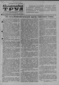 и Пролетарии всех стран, соединяйтесь iCbU u£Jcm ii£H sui 0 | гав Барагунекого райкома Коммунистической партеп Советского l.tuma в районною Совета депутатов трудящихся Новосибирской области №22 (2(53) Воскресенье, 15(еераня 1££6 г.[Цена 15 коп. Товарищи колхозники, работники МТС и совхозов, рабочие и служащие! Шире развернем социалистическое соревнование за выполнение и перевыполнение шестого пятилетнего плана! XX съезд Коммунистической партии Советского Союза Следующим выступает тов. И. В. КАПИТОНОВ I (Московская парторганизация). Центральный Ко- | митет КПСС, говорит он, обеспечил еще большее укрепление партийных организаций, повышение активности, инициативы широких партийных масс, знакомил коммунистов с важнейшими решениями партии и правительства, держал их в курсе вопросов, которые решала наша партия, весь советский народ. Коммунисты чувствовали и понимали, что к ним обращается, с ними советуется наш ЦК. Это вызывало живейший интерес и вдохновляло членов и кандидатов партии на успешное осуществление поставленных задач. На материалах Пленумов ЦК, постановлениях партии и правительства воспитывалась вся наша партия. Дальнейшее расширение связей с массами, повышение активности коммунистов способствовали достижению положительных результатов в хозяйственно-культурном строительстве. Промышленность Москвы и области выполнила досрочно задания пятой пятилетки. Это дало возможность народному хозяйству получить сверхплановой продукции на 28 миллиардов рублей. Объем производства увеличился по сравнению с 1950 го дом на 80 процентов, производительность труда возросла на 49 процентов. Выступление тов. К. Г. ЛЫСИНА (Алтайская парторганизация) было посвящено вопросам развития сельского хозяйства. Оратор отметил, что большая заслуга Центрального Комитета партии состоит в том, что он во-времн и с ленинской принципиальностью вскрыл серьезные недостатки и ошибки в сельском хозяйстве. Поставленный Центральным Комитетом партии вопрос об освоении целинных и залежных земель нашел горячую поддержку во всей стране. Тов. Пысин подчеркивает, что всего за два года в колхозах и совхозах Алтайского края за счет освоения целинных и залежных земель посевные площади возросли на три миллиона двести тысяч гектаров, а производство зерна увеличилось в три раза. Оратор указывает, что резервы Алтайского края по увеличению производства зерна не исчерпаны. Они заключаются прежде всего в значительном расширении посевов кукурузы, радикально решающей проблемы животноводства, в более широком внедрении методов агротехники, предложенных Т . С. Мальцевым. XX съезд Коммунистической партии Советского Союза продолжает свою работу. На утреннем заседании 16 февраля, проходившем под — председательством тов. А. И. КИРИЧЕНКО, был ^« а сл уш а н доклад председателя мандатной коыис- ' сии тов. А. Б. АРПСТОВА. —Мандатная комиссия,—сказал тов. Аристов,—установила, что во всех партийных организациях выборы делегатов на XX съезд проведены в строгом соответствии с требованиями Устава партии. Выборы проводились закрытым (тайным] голосованием. Проверка полномочий показала, что все делегаты, избранные на съезд, получили необходимое большинство голосов. Комиссия признала полномочия всех присутствующих на съезде делегатов действительными. На XX съезд избрано 1355 делегатов с пра- ^ в о м решаю