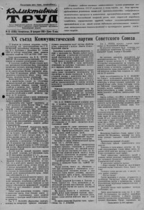 Пролетарии всех стран, соединяйтесь^ 1СЫЛи£кхгш&шй Т Р У Д Оргдн Карас/всвого райкома Коммунистической партиа*$1* <оиетекого Союза в районною Совета депутатов трудящихся Новосибирской области №25 (2056) |Воскресенье, 26 февраля 1956 г.[Цена 15 коп Главные задачи гиестого пятилетнего плана развития народного\ хозяйства СССР состоят в том, чтобы на базе преимущественного развития тяжелой промышленности, непрерывного технического прогресса и повышения производительности труда обеспечить дальнейший мощный рост всех отраслей народного хозяйства, осуществить крутой подъем сельскохозяйственного производства и на этой основе добиться значительного повышения материального благосостояния и культурного уровня ювет ского народа. XX съезд Коммунистической партии Советского Союза 23 февраля на утреннем заседании съезда, проходившем нод председательством той. Г. Е. БУРКАЦКОИ, продолжалось обсуждение доклада тон. Н. А. Булганина о Директивах I X съезда КПСС по шестому пятилетнему плану развития народного хозяйства СССР на 1956— 1960 годы. Слово предоставляется тов. Н. И. БОБРОВНИКОВУ (Московская парторганизация). Он остановился на вопросах реконструкции столицы. В городском хозяйстве Москвы создана крупная материально-техническая база, позволяющая значительно улучшить культурно-бытовое обслуживание населения столицы. В шестой пятилетке на реконструкцию Москвы намечается затратить более 25 миллиардов рублей. Значительно увеличится строительство жилых домов, школ, больниц, культурно-бытовых учреждений. Затем выступает тов. А. Н. КОСЫГИН. Партия и правительство, говорит он, обеспечивая преимущественный рост тяжелой индустрии, уделяют неослабное внимание подъему сельского хозяйства и развитию всех отраслей легкой и пищевой промышленности. В проекте Директив I X съезда предусматривается рост производства предметов потребления в новой пятилетке примерно на 60 процентов. Оратор приводит данные о росте производства в новой пятилетке основных промышленных товаров н продуктов питание. Производство всех тканей увеличится до 9.263 миллионов метров. Выпуск обуви в 1960 году достигнет 455 миллионов пар. Швейных изделий к концу пятилетки будет изготовляться более чем в полтора раза. Выработка сахара увеличится в два раза. Это полностью обеспечит потребности населения в сахаре и позволит широко развернуть выпуск кондитерских и других товаров. В шестой пятилетке в целом по стране в два раза увеличится производство мяса и молока. Большое развитие получит рыбная промышленность. I , Тов. К. П. ОРЛОВСКИЙ (Белорусская парторганизация) рассказывает о работе колхозников сельскохозяйственной артели «Рассвет», о планах на будущее. Колхоз объединяет более 1.200 дворов и имеет 9 тысяч гектаров земли. Он получает высокие доходы от всех отраслей хозяйства. Овощеводство и садоводство принесло более 1,5 миллиона, а льноводство— 7,5 миллиона рублей. В истекшем году колхоз надоил в среднем от каждой фуражной коровы по 2.920 килограммов молока. Животноводство дало сельхозартели 5,2 миллиона рублей. В 1955 году на каждый трудодень выдано по 30 рублей деньгами, по 3 килограмма зерна, по 10 килограммов картофеля и т д. Следующим выступает тов. Н. К. БАЙБАКОВ, Характеризуя особенности разработки проекта Директив съезда по шестой пятилетке, он говорит, что в этой работе широкое участие прин