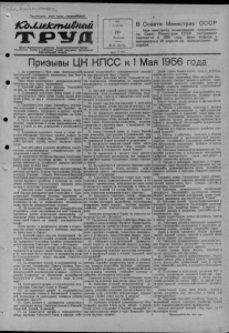 2. КОЛЛЕКТИВНЫЙ ТРУД Призывы ЦК КПСС н 1 Мая 1956 года (Окончание. Начало на 1-й схр.) 45. Горячий привет работникам сельского хозяйства, осваивающим целинные и залежные земли! Создадим мощную базу производства зерна в восточных районах страны. 46. Колхозники и колхозницы, работники МТС и совхозов, специалисты сельского хозяйства! Всемерно расширяйте посевы и повышайте урожайность кукурузы—важнейшего источника увеличения производства зерна и создания прочной кормовой базы для животноводства! 47. Работники сельского хозяйства! Успешно проведем весенние полевые работы, обеспечим хороший уход за посевами и получение высокого урожая в 1956 году! Обеспечим своевременное выполнение обязательств перед государством по сдаче сельскохозяйственной продукции. 48. Колхозники и колхозницы, работники МТС и совхозов, специалисты сельского хозяйства! Повышайте культуру сельскохозяйственного производства, широко внедряйтев колхозах и совхозах достижения науки и передовой опыт! Увеличим выход продукции земледелия и животноводства на 100 гектаров сельскохозяйственных угодий при наименьших затратах труда и средств! 49. Колхозники и колхозницы, работники МТС и совхозов, специалисты сельского хозяйства! Всемерно развивайте общественное животноводство и повышайте продуктивность скота! Дадим стране больше продуктов животноводства! 50. Колхозники и колхозницы, работники МТС и совхозов, специалисты сельского хозяйства! Расширяйте производство и повышайте урожайность хлопка, льна, сахарной свеклы, других технических культур,овощей, картофеля! 51. Работники сельского хозяйства! Настойчиво боритесь за полное использование техники, за внедрение комплексной механизации и электрификации во все отрасли сельского хозяйства! 52. Колхозники и колхозницы! Больше проявляйте творческой инициативы в организации колхозного производства и в управлении делами артели, укрепляйте трудовую дисциплину, повышайте производительность труда! Обеспечим всемерное развитие общественного хозяйства колхозов! 53. Работники машинно-тракторных станций! Боритесь за повышение урожайности всех сельскохозяйственных культур и продуктивности общественного животноводства в колхозах, за выполнение планов заготовок сельскохозяйственных продуктов! Лучше используйте тракторы, комбайны и другие машины, снижайте себестоимость тракторных работ, сокращайте затраты на производство сельскохозяйственной продукции! 54. Работники совхозов! Лучше используйте земельные угодья, повышайте урожайность полей и продуктивность животноводства! Улучшайте организацию производства и использование техники! Превратим все совхозы в образцовые высокотоварные и рентабельные предприятия! 55. Работники местной промышленности и промысловой кооперации! Увеличивайте производство товаров народного потребления, хозяйственного инвентаря и строительных материалов! Лучше исполь-■ зуйте местное сырье, улучшайте качество и снижайте себестоимость изделий, расширяйте сеть предприятий бытового обслуживания и улучшайте их работу! 56. Работники государственной и кооперативной торговли! Повышайте культуру советской торговли! Полнее удовлетворяйте потребности трудящихся в товарах! Добивайтесь коренного улучшения работы предприятий общественного питания! 57. Работники железнодорожного транспорта! Обе