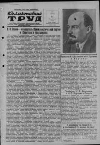 22 апреля 1956 года, № 49 КОЛЛЕКТИВНЫЙ ТРУД Ленин —будет житьЦ (В. Маяковский) В рабочем кабинете и в квартире В. И. Ленина в Кремле ? Много в Московском Кремле памятных исторических мест. р)дно из них— здание, где с первых лет революции работало Советское правительство и где сейчас работает Совет Министров СССР. На третьем этаже этого дома находятся рабочий кабинет и квартира основателя Коммунистической партии и Советского государства Владимира Ильича Ленина. С чувством огромного волнения переступают посетители порог кабинета. Вот письменный стол, плетеное кресло, книги в шкафах, географические карты, на которые Владимир Ильич наносил пометки. Всё здесь напоминает о Ленине,1 говорит о неутомимой, кипучей «деятельности главы Советского правительства. В канун 86-й годовщины со дня рождения Владимира Ильича в кабинет и квартиру пришла группа людей, лично знавших Ленина. Среди них первый комендант Кремля И. Д. Мальков, сотрудница секретариата В. И. Ленина т. Голубева, личный библиотекарь Владимира Ильича Ш. Н. Манучарьянц, Е. И. Смирнова, ухаживавшая за Лениным во время его болезни. Они делились с собравшимися воспоминаниями о разных периодах жизни и работы Ленина в Кремле. Идут все новые и новые посетители. И каждого, кто осматривает рабочий кабинет и квартиру Ленина, поражает скромность обстановки, в которой жил и работал великий вождь пролетариата. Об этом свидетельствуют многочисленные записи в книге впечатле ний посетителей. (ТАСС). :# ' V " Г * * * Башкирская АССР. Уфимский мемориальный дом-музей В. И. Ленина посещают в эти дни тысячи трудящихся. Сюда ■ совершаются экскурсии с заводов и фабрик, колхозов и учебных заведений Башкирии и соседних областей. На снимке: мемориальный дом-музей В. И. Ленина. Фото Г. Ефимова. * * * Идеи В. И. Ленина об электрификации страны в действии В. И. Ленин и Н. К. Крупская в Горках. 1922 год. зацию провел. Переймешь хороший производственный опыт, дашь больше продукции обществу, больше тебе и почета, больше и заработаешь,— в этом и заключается ленинский принцип личной заинтересованности работников в результатах своего труда при социализме.Он пронизывает политику Коммунистической партии и Советского государства в области труда как в городе, так и в деревне. В шестой пятилетке денежные и натуральные доходы колхозников повысятся в среднем не менее чем на 40 процентов. Это будет достигнуто при том условии, что производительность труда в колхозах за пятилетие повысится примерно вдвое. При современном высоком уровне механизации сельского хозяйства, настойчивой работе по устранению недостатков в организации труда в колхозах намеченное планом задание по производительности труда может быть значительно перевыполнено. Так говорит сама жизнь, и к этому ведут дело Коммунистическая партия и', Советское правительство. После XX съезда КПСС приняты новые широко известные постановления об Уставе сельскохозяйственной артели и о ежемесячном авансировании колхозников. В них мудро и последовательно выражена ленинская линия на всемерное развертывание инициативы колхозников в развитии коллективного хозяйства и повышение личной материальной заитересован- ности тружеников села в обобществленном производстве. Успех пятилетки в сельскохозяйственном производстве решают колхозники, работники МТС и совхозов. Как полноправные тв