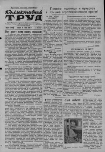 Пролетарии всех стран, соединяйтесь! 10кие1ст и£нш Орган Карасукского райкома Коммунистической партии Советского Союза и районного Совета депутатов трудящихся Новосибирской области №[55 (2086)| Среда, 9 мая 1956 г. | 15коп.' Шрие дорогу всему новому, передовому В районе все шире развертывается социалистическое соревнование за проведение весеннего сева в лучшие агротехнические сроки, с высоким качеством работ. Отличительной особенностью нынешней весны, первой весны шестой пятилетки является небывалый трудовой подъем на колхозных и совхозных полях, стремление хлеборобов и механизаторов как можно полнее использовать имеющуюся технику, проявление инициативы и творчества в большом и малом деле. Эти благородные проявления советских людей вызваны вдохновляющими решениями XX съезда КПСС. Решающая роль в проведении сева в лучшие сроки и с высоким качеством принадлежит механизаторам. Поступающие вести с полей говорят о том, что механизаторы с сознанием долга относятся к делу, систематически перевыполняют задания. Первой в районе закончила плановый сев пшеницы тракторная бригада С. Новака из Чернокурьин- ской МТС, успешно справились с этой задачей бригады тт. Вольвача, Шилко, Пахолкина из Хорошинской МТС. Примеров самоотверженной работы можно привести много. Но дело не только в высокопроизводительном труде, а в творческом подходе к делу, в инициативе по внедрению в сельскохозяйственное производство всего нового, передового. Перед началом сева во всех МТС было проведено укрупнение тракторных бригад, сокращен штат прицепщиков. Это мероприятие не вызвало ни снижения производительности труда, ни качества работ, а экономический эффект вполне очевиден. Ценную инициативу проявили хорошинские механизаторы. Узнав, что в соседнем, Бурлинском районе, Алтайского края, вместе с севом зерновых закладываются кулисы, онине замедлили этот важный агроприем внедрить у себя. Для посева кулис переоборудуется зерновая сеялка- одна ее половина. Туда засыпаются семена кукурузы. Агрегат из трех сеялок высевает пшеницу. После трех проходов такого агрегата половина переоборудованной сеялки выключается с сева пшеницы и вместо ее высевается три строчки кукурузы с междурядьями по 60 сантиметров. При новом заезде опять все три сеялки вывевают пшеницу. Таким образом, расстояние между кулисами получается по 40 метров. Это не помешает при уборке пшеницы, а также во время пахоты. За высеянной кукурузой во время лета будет проведен уход, осенью будут сняты початки, а зимой стебли ее с успехом будут использованы для снегозадержания. Для кулис можно использовать и подсолнечник. Сейчас закладку кукурузных кулис одновременно с севом пшеницы ведут почти все тракторные бригады Хорошинской МТС. Для этой цели переоборудовано 14 сеялок. Почин хорошинцев заслуживает пристального внимания и повсеместного внедрения. Большое распространение нынче получила заготовка ранних паров, причем пашутся они преимущественно по методу колхозного ученого Т. С. Мальцева. Успешно справляются с этой задачей тракторные бригады Карасукской МТС, поднимаются такие пары в Октябрьской зоне. Нынеч больше, чем в предыдущие годы, посеяно подсолнечника квадратно-гнездовым способом, а также пшеницы узкорядным и перекрестным способами. В колхозе «Вперед к коммунизму» осенью прошлого года было 