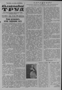 20 июня 1956 года, № 74 КОЛЛЕКТИВНЫЙ ТРУД Черкасская область. Труженики колхоза имени Сталина ^Черкасского района, отвечая на призыв партии и правительства об увеличении валового сбора зерна, прилагают все усилия для получения в первом году новой пятилетки высокого урожая всех сельскохозяйственных культур. Сейчас в колхозе заканчивается подготовка инвентаря для проведения своевременной уборки урожая без потерь. Среди зерновых культур в сельхозартели большое место занимает кукуруза. В прошлом голу колхозники вырастили на площади 334 гектара по 37,1 центнера кукурузы в зерне с каждого гектара. В нынешнем году площадь под этой культурой увеличина почти вдвое. Большое внимание колхозники уделяют подготовке кукурузохранилищ и силосных сооружений. Здесь насчитывается 32 силосных облицованных ямы ёмкостью около тысячи тонн, а для сохранения початков кукурузы построено пять кукурузохранилищ на 500 тонн. Строительная бригада колхоза успешно ведет строительство еще двух новых кукурузохранилищ на двести тонн. На снимке: общий вид строительства кукурузохранилищ. На переднем плане—плотник Василий Мормуль. Фото И. Диамента. Фотохроника ТАСС. ------------------------------------- — # * --------------------------------------- Новому урожаю— хорошие дороги Прошла первая декада месячника по усиленному ремонту дорог и мостов. Многие хозяйства с первых дней месячника активно включились в подготовку дорог к перевозкам зерна нового урожая. Так, сельхозартели им. Андреева, «Путь к коммунизму» и им. Сталина выделили для этого специальные бригады колхозников. Хорошинская, Октябрьская и Чернокурьинская МТС послали на ремонт дорог грейдеры, скреперы и другие машины. Однако некоторые колхозы, как, например, им. Молотова, им. Джамбула, «Красный пу- тиловец» никакого участия в месячнике не принимают. Председатели этих колхозов тт.Гер- герт, Бородин и Угренинов и председатели сельских Советов, на территории которых находятся эти колхозы, не выполняют решение исполкома райсовета и бюро райкома партии об организации работ по ремонту дорог. Не принимают участия в ремонте дорог Карасукская МТС. Дирекция МТС до сего времени не выделила на дорожные работы скрепер, который простаивает в бездействии на усадьбе МТС. Не включились в месячник по строительству автобаза «Россов- хозтранса» и авторота. На территории автобазы простаивает бульдозер. Руководители автороты до сего времени не выделили ни однйо машины, хотя, казалось бы, кому, как не автохозяйствам, больше всего надо было заботиться о благоустройстве дорог и мостов района. И. Меленчук. В колхозе яПуть Ленина* Передовые пастухи Большим уважением пользуются в колхозе скотники- пастухи второй комплексной бригады Егор Темолинг и АндрейШтели. За ними закреплено 146 коров. Более 20 лет работает на ферме Егор Темплинг. Зимой он трудится скотником, а летом—пастухом. Опыт передового пастуха перенимает Андрйе Штели. Пастухи хорошо изучилипастбища, разбили их на загоны и ведут поочередное стравливание. Сейчас надои молока от закрепленной за ними группы коров резко возросли. Так, например, в мае доярка Олинда Майер получила от каждой фуражной коровы 249 литров молока, а за 8 месяцев—858 литров. Свыше 800 литров надоили доярки тт. Гидион и Май. Из местных стройматериалов Нынче в колхозе ведется большое строительство животноводческих помещений. Для эти