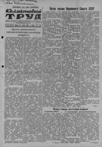 18 июля 1956 гада, № 86 КОЛЛЕКТВИНЫЙ ТРУД 3. В райкоме КПСС и райисполкоме Об итогах месячника по строительству в колхозах Письма в редакцию Комсомольцы ПОМОГЛИ Редкие гости V избирателей Рассмотрев итоги месячника по строительству животноводческих помещений и других объектов в колхозах, бюро райкома КПСС и исполком райсовета определили передовые хозяйства, успешно ведущие строительство. Первое место признано за колхозом «Путь Ленина» (председатель т. Русинов, секретарь парторганизации т. Гришин). Колхоз изготовил более 100 тысяч штук самана, заготовил 150 кубометров леса, ведет строительство 10 общественных построек. Второе место присуждено колхозу им. Андреева (председатель т. Панкратьев, секретарь парторганизации т. Ки па), выработавшему более 40 тысяч штук самана, заготовившему 305 куб. м леса и ведущему строительство 11 объектов. На третье место вышел колхоз им. Дзержинского (председатель т. Бунин, секретарь парторганизации т. Литко). В колхозе самая высокая иыработка на строительных работах, сооружается 8 помещений. Четвертое место занял колхоз «Маяк Ильича» (председатель т. Горелов, секретарь парторганизации т. Рассказов), обеспечивший высокую выработку на строительстве. В артели ведется строительство 8 крупных объектов. Отмечена хорошая работа по строительству общественных зданий в колхозе им. Тельмана (председательт. Крупа, секретарь парторганизации т. Васильев). Бюро райкома партии и исполком райсовета указали руководителям колхозов им. Калинина (председатель т. Ло- пин, секретарь парторганизации т. Леонов), им. Джамбула (председатель т. Бородин, секретарь парторганизации т. Ал- дунгаров), им. Сталина (председатель т. Максюта), «Красный путиловец» (председатель т. Угренинов, секретарь парторганизации т. Галаган) на плохую организацию строительных работ в период месячника, а также обратили внимание руководителей и секретарей партийных организаций предприятий, шефствующих над колхозами, на их удовлетворительное выполнение принятых обязательств по оказанию помощи подшефным колхозам. Придавая важное значение строительству животноводческих помещений, силосных сооружений и других объектов, бюро райкома партии и исполком райсовета обязали директоров МТС,руководителей колхозов и шефствующих организаций принять необходимые меры по усилению строительства намеченных объектов в каждом коЛхозе. Из года в год наше огородное звено выращивает хорошие урожаи бахчевых и овощных культур. Экспонаты дынь, арбузов, картофеля с нашего участка постоянно демонстрируются на районной сельхоз- выставке, ставятся в пример другим хозяйствам. О нашем участке, можно сказать без преувеличения, знают все в районе. А вот в нашем колхозе этому участку никакого внимания не уделяется, особенно летом, в период ухода за бахчами. Нынче не в состоянии справиться с прополкой своим звеном, в которое входит всего четыре престарелых колхозницы, я обращался за помощью и в правление артели, и к общественным организациям села, но помощи никакой не получил. Очень печально, но у нас некоторые считают, что черная работа для них унизительна. А вот комсомольцы и молодежь. прибывшие к нам в колхоз из Новосибирска с завода «Сибсельмаш», другого мнения. Они вместе с руководителем Александром Дмитриевичем Карпаевым охотно откликнулись на мою просьбу, горячо, с комсомол