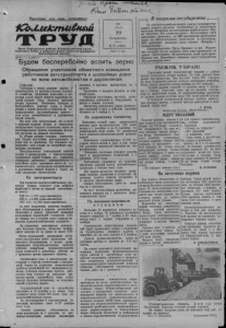2. КОЛЛЕКТИВНЫЙ ТРУД 29 июля 1956 года, № 91 Работы ведутся комплексно Проявляя заботу о создании теплой и сытой зимовки для скота, члены второй комплексной бригады колхоза «Путь Ленина» высокопроизводительно трудятся на заготовке кормов и строительстве животноводческих помещений. Полным ходом возводится саманная кошара на 500 овец, ведется внутренняя отделка свинарника. Укладчик самана Я. Бендер, плотники Ф.Шнайдер, А. Бендер систематически перевыполняют производственные задания. Большая забота проявляется о заготовке сочных кормов. Колхозники решили заложить силоса из расчета 6 тонн на одну голову крупного рогатого скота и 5 тонн на взрослую свинью. Они уже заложили в траншеи 310 тонн силосной массы из разнотравья. Добросовестно трудятся на отгрузке силосной массы от комбайна тт. Захарчук, Игнатенко, посланцы г. Новосибирска тт. Жилов и Гордеев. На машинах они делают по 15 рейсов в день на расстоянии 8-9 километров. Одновременно со строительством и заготовкой кормов в бригаде ширится фронт уборочных работ. Комбайнер Октябрьской МТС т. Векисер скосил виндроуэром 120 гектаров ячменя. 26 июля началась подборка и молотьба зерновых.Т. Готфрид комбайном с подборщиком за один день убрал ячмень с 30 гектаров, Члены второй комплексной бригады стремятся досрочно рассчитаться с государством по зернопоставкам. На заготовительный пункт они отправили больше 100 центнеров рыжика и ячменя. А. КРОММ. HR ПОДБОРКЕ СЕНЯ С первых дней сеноуборки добросовестно трудится в колхозе имени Жданова тракторист Чернокурьинской МТС Иосиф Ваймер. На тракторе «У-2» он убрал корма сеноподборщиком с площади более 900 гектаров. Слаженно работают в этом агрегате прицепщики Па расковья Кумейко и Николай Пискарев. Благодаря этому т. Ваймер ежедневно собирает сено с площади 37-45 гектаров вместо 30 га по норме. А. ЦУКАНОВ. Упускают дорогое время Много еще травы, густой, сочной, на полях второй полеводческой бригады колхоза «Новая семья». Стоит она, грустно покачиваясь на ветру, сиротливо ожидая, когда дойдет очередь до нее. А очередь не доходит. Медленно идет косовица в бригаде. —Плохо заботятся о сенокосе руководители нашей МТС,—говорит бригадир тракторной бригады И. Терехов.— Взять к примеру распределение сенокосной техники. В восьмой тракторной бригаде план покоса вдвое меньше, но им дали два сенокосильных агрегата, а нам только одну самоходку. И лишь недавно решили восстановить «справедливость»: из восьмой к нам перегнали три прицепные сенокосилки. Но только ли в распределении техники причина ? Нет. Главная беда в том, что в МТС равнодушно относятся к плохой работе сенокосильной техники. На самоходной сенокосилке скосили 560 га и у нео вышел из строя мотор. Отвезли в мастерскую. —Я посоветовал заменить только кольца и поршни, —говорит т. Терехов.—На это ушло бы не больше одного дня. —Нет, будем делать капитальный ремонт,—категорически заявил механик-контролер т. Кругликов. Куда же смотрел т. Кругликов зимой, когда выпускал из мастерской эту самоходку после капитального ремонта? Ведь тогда можно было ремонтировать и капитально и качественно: время позволяло. Нот.Кругликов решил провести эту работу за счет горячих дней сеноуборки. За два дня можно было отремонтировать мотор капитально, но сенокосилка простояла на усадьбе МТС восемь дней. Во второй бригаде заскирдовано 32