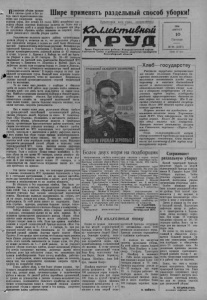 2- КОЛЛЕКТИВНЫЙ ТРУД Больше картофеля стране Обращение колхозников, колхозниц, работников МТС и совхозов, специалистов сельского хозяйства Брянской области Труженики сельского хозяйства Брянской области обратились ко всем колхозникам, колхозницам, работникам ШТС и совхозов, специалистам сельского хозяйства с призывом развернуть социалистическое соревнование за увеличение производства картофеля, за досрочное выполнение и перевыполнение планов заготовок и закупок картофеля. Выполняя исторические решения XX съезда Коммунистической партии Советского Союза, говорится в обращении, труженики сельского хозяйства Брянской области в текущем году в лучшие агротехнические сроки провели весенний сев и хорошо организовали уход за посевами. На полях колхозов и совхозов зреет высокий урожай. Борясь за выполнение постановления ЦК КПСС и Совета Министров СССР «Об увеличении производства и заготовок картофеля и овощей», говорится далее в обращении, широко развернув социалистическое соревнование, колхозы и совхозы области перевыполнили в текущем году план посадки картофеля, расширили посевные площади и довели их до 126 тысяч гектаров. Посадку провели квадратно-гнездовым, способом, в лучшие агротехнические сроки, под картофель внесено 1700 тысяч тонн навоза и торфа. Подсчитав свои возможности, труженики сельского хозяйства Брянской области взяли на себя следующие обязательства: вырастить в 1956 году урожай картофеля в колхозах со всей площади не менее 125 центнеров с каждого гектара и в совхозах—не менее 140 центнеров с гектара; собрать валовой сбор картофеля не менее полутора миллионов тонн, увеличив его производство по сравнению с 1955 го дом в 1,8 раза. Мы боремся за то, чтобы задание шестого пятилетнего плана по увеличению производства картофеля выполнить досрочно, в 1957 году. Отдельные районы, колхозы, бригады и звенья взяли более повышенные обязательства. Государственный план заготовок и закупок картофеля решено выполнить досрочно, к 20 октября сего года, и сдать государству сверх плана не менее 50 тысяч тонн, а всего 300 тысяч тонн. Намечено также полностью засыпать потребное количество семян отборными сортовыми клубнями, выделить на корм скоту не менее 600 тысяч тонн картофеля из расчета 9 тонн на свиноматку и 3 тонны на корову и увеличить выдачу картофеля колхозникам на трудодни. Скармливание картофеля на корм скоту даст возможность колхозам и совхозам резко увеличить производство мяса и молока. Решая задачу увеличения производства картофеля, мы одновременно боремся за выполнение принятых нами планов по увеличению производства зерна, овощей, технических культур, мяса, молока и других продуктов. Особое внимание уделяем выращиванию к у курузы, как важнейшей кормовой культуры. 10 августа 1956 года, № 96 тт — p p w w В плену зеленых настроений Колхоз им. Жданова по темпам уборки урожая занимает одно из последних мест в соревновании колхозов района. Однако это мало беспокоит правление артели. —Мы позже других сеяли,—говорит председатель т. Лебедев,—Хлеба еще не поспели. И, словно оправдывая слова председателя, не спеша ползают по полю три прицепных комбайна, часто останавливаясь то по техническим неисправностям, то из-за плохой отвозки зерна. За 8 дней убрано ими око ло 400 гектаров. Но и при этих „темпах" в обеих тракторных бригадах, обслужив