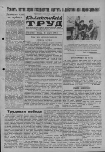 КОЛЛЕКТИВНЫЙ ТРУД 31 августа 1956 года, № 109 Президент Индонезии Сукарно в Москве Прибывший в Москву Президент Республики Индонезии Сукарно 29 августа нанес визит Председателю Президиума Верховного Совета СССР К. Е. Ворошилову. Беседа прошла в обстановке сердечности и дружбы. В тот же день д-р Сукарно был принят Председателем Совета Министров СССР Н. А. Булганиным. Председатель Президиума Верховного Совета СССР К. Е. Ворошилов днем в Большом Кремлевском Дворце дал завтрак в честь Президента Индонезии Сукарно. На завтраке присутствовали Президент Сукарно, посол Республики Индонезии Л. Н. Палар, прибывшие с Презш дентом другие официальные лица Индонезии, ^советской стороны были товарищи Н. А. Булганин, Л. М. Каганович, Г. М. Маленков, А. И. Микоян, М. Г. Первухин, М. 3 Сабуров, М. А. Суслов, Н. С. Хрущев, Л. И. Брежнев, Д. 1. Н1е- пилов, А. Б. Аристов, Н. И. Беляев, П. Н. Поспелов и другие. Во время завтрака, который прошел в теплой дружеской обстановке, К. Е. Ворошилов и Сукарно обменялись речами. Президент Индонезии д-р Сукарно и сопровождающие его лица посетили Мавзолей В. И. Ленина и П. В. Сталина и возложили венок. Находившиеся в это время на Красной площади москвичи горячими аплодисментами приветствовали Президента дружественной Индонезии. Много времени Президент Сукарно и прибывшие с ним лица уделили осмотру Всесоюзных промышленной и сельскохозяйственной выставок, многие гости из Индонезии совершили поездку по трассе московского метрополитена. (ил Григоры ч Черцов | ОБЕЩАННОЕ ПОЛГОДА ЖДЕМ Все лето мы живем на полевом стане: от начала посевной и до конца уборочной кампаний. Но не всегда имеем возможность быть в курсе всех событий, происходящих в стране и за рубежом. Газеты получаем нерегулярно и не во время. Нет у нас и радиоприемника. По радио можно и концер ты интересные послушать, и лекции, и последние известия. Обращались мы с просьбой к председателю колхоза им. Ка линина т. Лопину, чтобы на полевой стан поставили радиоприемник. — Хорошо, привезем,— обе щает он всегда, но не привозит. Были у нас много раз и секретарп колхозной парторганизации и МТС тт. Леонов и Илюшин. Но и они тоже отделываются одними обещаниями. Вот уже полгода мы ждем обещанного, но не можем дождаться. Трагическая смерть вырвала из рядов коллектива Черно- курьинской МТС старейшего механизатора района члена КПСС комбайнера Нила Григорьевича Черцова. Славный и благородный жизненный путь прошел Н. Г.Черцов от рядового тракториста до механика МТС. Нил Григорьевич Черцов родился в 1906 году и вырос в бедной крестьянской семье. В 1930 году, когда в нашем районе организовалась Кара- сукская МТС, он одвим из первых сел за руль трактора. Вскоре, как опытного тракториста и хорошего организатора, его выдвинули бригадиром тракторной бригады. С 1941 года в течение 13 лет Нил Григорьевич Черцов работал механиком Белой, а затем Чернокурьинской МТС. В 1954 году он пошел работать комбайнером Чернокурьинской МТС. 30 августа Нил Григорьевич Черцов трагически погиб на трудовом посту. Механизаторы района и коммунисты районной партийной организации знают Н. Г. Черцова как честного, добросовестного труженика и отзывчивого товарища. Многие механизаторы знают его как своего старшего товарища и учителя. За долголетнюю и безупречную работу в машинно тракторной станции Нил Григорьевич Черцов занесен в «Почетн