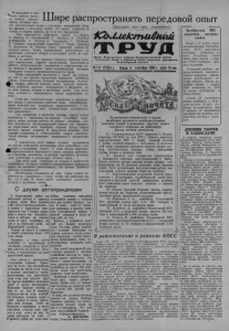 Шире распространять передовой опыт ^ В колхозах и совхозах района имеется немало передовиков, которые вносят значительный вклад в успешное завершение уборки урожая и заготовок хлеба. Их имена известны не только в нашем районе, но и за его пределами. Э то—машинисты лафетных жаток А. Ярцев, А. Киндер, Н. Лисовитский, А. Зимбзль, В. Голубев; комбайнеры С. Жуков, А. Орищенко, Г. Руденок, Я. Ганаман; заведующий сушилкой Г. Таран, шоферы Н. Цыганков, М. Наумов. Здесь приведен далеко не полный список. Таких передовиков, работающих на различных участках уборки и заготовки хлеба, не единицы, а десятки. В их работе нет никаких секретов. Причина успехов—тщательная, заранее продуманная подготовка к работе, добросовестное отношение к порученному делу, поиски и внедрение таких нововведений, которые позволяют поднять производительность труда. Наши передовики находятся в таких же условиях, как и все прочие труженики сельского хозяйства района. Следовательно, каждый механизатор, колхоз- Щшк, шофер, рабочий совхоза имеет полную возможность добиться высоких показателей и закрепить их на весь период уборки и заготовок хлеба. Для этого надо учиться у передовиков, смело перенимать их опыт. Иной раз незначительные изменения в организации труда, в расстановке рабочей силы, переоборудование машины или механизма применительно к создавшимся условиям дают значительные положительные результаты. Так, например, в прошлом номере нашей газеты комбайнер А. Орищенко из совхоза „Октябрь" поделился своим опытом работы на уборке влажных хлебов. Коллектив, обслуживающий агрегат тов. Орищенко, переставил деки барабана, первый битер обшил жестью, сделал лопасти. В результате комбайн стал хорошо скашивать и обмолачивать сырую пшеницу. Такой пример заслуживает поддержки и распространения. К сожалению, дела наших лучших тружеников не всегда становятся достоянием всех работников кол- ^^)зных и совхозных полей. С этим нельзя мириться. Ч^спространением передового опыта должны заниматься агрономы, механики, секретари партийных организаций, агитаторы и редакторы стенных газет. При этом надо сообщать не только о количестве скошенных гектаров хлебов и намолоченных центнеров зерна, но детально рассказывать, как можно Добиться высоких показателей. Необходимо поднимать на щит славы наших передовиков, стремиться к тому, чтобы все работали так же, как и они. В этом—залог успешного окончания уборки и заготовок хлеба. — ©— С двумя автоприцепами В Карасукский район на Iбайны успевают наполнить уборочные работы я приехал [оставшийся прицеп и набрать Пролетарии всех стран, соединяйтесь! iG K lueJcrnuSnsui Орган Карасукского райкома Коммунистической партии Советского Союза и районного Совета депутатов трудящихся Новосибирской области К»1П(2142)| Среда, 5 сентября 1956г. цена 15копв конце июля. Мою машину «ЗИС-150»(грузоподъемность— 4 тонны) с двухосным автоприцепом (на 3 тонны) направили в колхоз им. Буденного. Здесь я работаю на отвозке зерна от двух комбайнов на ток и на перевозке хлеба на Карасукский элеватор. Только за август я перевез в общей сложности более 600 тонн зерна. Стремясь к тому, чтобы комбайны не простаивали в ожидании разгрузки, а грузовик работал на полную мощн о с т ь , я использовал еще одпн трехтонный прицеп. Свою работу я организовал следующим образом. Приезжая на поле, два авт