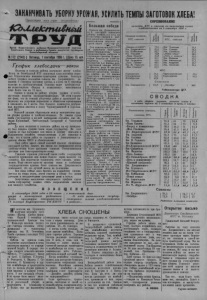 ЗАКАНЧИВАТЬ УБОРКУУРОЖАЯ, УСВОИТЬТЕМПЫЗАГОТОВОКХЛЕБА! Пролетарии всех стран соединяйтесь! ICbUujtfcnui&Hsai Орган Карасукского райкома'Коммунистической партиен Советского Союза и районного Совета депутатов трудящихс Новосибирской области №112 (2143) | Пятница, 7 сенятбря 1956г. |Цена 15 коп Г j:афик хлебосдачи— закон Колхозы и совхозы района завершают жатву хлебов- Вслед за Октябрьской МТС закончила план косоввды зернов ы х Студеновская машинно-тракторная станция. Большую победу одержал коллектив совхоза им. Дзержинского, завершив 5 сентября косовицу хлебов, а в ночь на 6 сентября задание по хлебозаготовкам. Успешно ведет хлебозаготовки сельхозартель «Вперед к коммунизму», выполнившая план более чем на 70 проц. Однако в целом по району уборка урожая и хлебозаготовки ведутся неудовлетворительно. Об этом говорит тот факт, что по темпам уборочвых работ в прошедшей пятидневке мы уступили первенство в областном соревновании и оказались на 9 месте. Еще большое количество неубранных массивов имеется в зонах Чернокурьинской и Хорошин- ской МТС. Большой разрыв образовался между выполнением плана уборки урожая и хлебозаготовками. По темпам сдачи хлеба государству в се]вой пятидневке сентября нас обо гнали Купинский, Чистоозерный, Татарский и Чановский районы. До всех колхозов и совхозов района на эту пятидневку был доведен график сдачи зерна государству. Но этот график не был воспринят как закон и потому оказался в ►большинстве хозяйств невыполненным. А это повлекло к ‘ тому, что в целом район не справился с пятидневным заданием обкома КПСС и облисполкома. Наш район имеет самый высокий процент скошенных площадей хлебов. Значит, мы имеем все возможности вести хлебозаготовки более высокими темпами. Установившиеся погожие дни благоприятствуют этому. Главным тормозом успешной сдачи хлеба государству является стремление как можно больше зерна вывезти на элеватор. При недостатке транспорта этого сделать невозможно. Надо смелее идти на засыпку зерна в глубинные государственные пункты. Опыт совхоза им. Дзержинского показывает, что это лучший выход из положения. Все силы сейчас надо бросить на подработку скопившегося на токах зерна, вести очистку и сушку его всеми ручными и механическими средствами днем и вочью. Безусловное выполнение ежедневного графика сдачи хлеба государству должно стать непреложным законом для каждого хозяйства. И З В Е Щ Е Н И Е 'Л Л Л А Л Л »\ , H /V W W W Большая победа Совхоз им. Дзержинского б сентября завершил уборку хлебов, а в ночь на 6 сентября первым в рай оне досрочно справился с выполнением задания по сдаче зерна гог'.у^дг-чи. Эта замечательная1 1' да одержана благодаря самоотверженному труду механизаторов, рабочих и служащих совхоза. В авангарде борьбы за хлеб находились коммунисты. Коллектив 4-й фермы, возглавляемый членом КПСС В. Данько, еще 19 августа завершил уборку зерновых. Вскоре закончила косовицу хлебов на 1-й ферме тракторно - полеводческая бригада коммуниста т. Са- рапулова. Механизаторы, несмотря на плохие условия погоды, показывали образцы труда. Комбайнер коммунист А. Бойченко и его жена трактористка Г. Бойченко „Сталинцем-6* убирали в день по ЗБ—40 гектаров. Самоходчик К. Щанкин скашивал в сутки до 30 га, а на подборке валков довел выработку до 37 гектаров. За самоотверженный труд семь комбайнеров, трактористов 