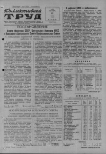Пролетарии всех стран, соединяйтесь) fChUa£Jcrnu£tmii Орган Карасукского райкома Коммунистической партии и Советского Союза и районного Совета депутатов трудящихся Новосибирской области 1956 СЕНТЯБРЬ 12 Среда № 114 (2145) Цена 15 коп. ПОСТАНОВЛЕНИЕ Совтеа Министров СССР, Центрального Номнетат КПСС иВсесоюзногоЦентрального СвоеатПрофесиональныхСоюзов О повышении заработной платы низкооплачиваемым рабочим и служащим В целях дальнейшего улучшения материального благосостояния трудящихся Совет Министров Союза ССР,Центральный Комитет КПСС и Всесоюзный Центральный Совет Профессиональных Союзов постановляют: 1. Впредь до проведения мероприятий по общему упорядочению заработной платы рабочих и служащих повысить с 1 января 1957 года заработную плату низкооплачиваемым рабочим и служащим, установив ее: а) рабочим и служащим, занятым непосредственно на промышленных предприятиях, стройках, предприятиях транспорта и связи,—в размере не менее 300—350 рублей в месяц; б) остальным рабочим и служащим, а также младшему обслуживающему персоналу и работникам охраны промышлен- кных предприятий, строек и предприятий 'транспорта и связи в городах и рабочих поселках—в размере не менее 300 рублей и в сельских местностях—не менее 270 рублей в месяц. Настоящее повышение заработной платы распространяется на рабочих и служащих, которые имеют тарифную ставку или должностной оклад ниже указанных размеров. 2. Установить, что выплата рабочим и служащим за выполнение* и перевыполнение норм выработки, премий, выплата за сверхурочную работу, за работу в праздничные дни и в ночное время, надбавок и вознаграждений за выслугу лет, а также надбавок за работу в районах Крайнего Севера и приравненных к ним местностях, в безводных и высокогорных районах производится сверх размеров заработной платы, указанных в пункте 1 настоящего Постановления. Эти выплаты исчисляются исходя из действующих на предприятиях, в организациях и учреждениях тарифных ставок и должностных окладов. ' 3. Поручить министрам и руководителям ведомств СССР и Советам Министров союзных республик определить в месячный срок во согласованию с Государственным комитетом Совета Министров СССР по вопросам труда, и заработной платы и ВЦСПС минимальный размер заработной платы по отдельным отраслям в пределах, указанных в подпункте «а» пункта 1 настоящего Постановления. 4. Установить, что в тех случаях, когда рабочие и служащие проработали неполный месяц, размер заработной платы определяется пропорционально времени, отработанному в данном месяце. 5. Оплату труда учеников на предприятиях, стройках, в организацш: и учреждениях производить в соответствии с действующим порядком. Оплату труда рабочих и служащих, проходящих обучение в связи с переквалификацией, производить в соответствии с пунктом 1 настоящего Постановления. 6. Признать необходимым отменить с 1 января 1957 г. взимание подоходного налога и налога на холостяков, одиноких и малосемейных граждан СССР с рабочих, служащих и учащихся, получающих заработную плату или стипендию в размере по 370 рублей в месяц. Внести на утверждение Президиума Верховного Совета СССР проект Указа о повышении размера не облагаемого налогами минимума заработной платы рабочих и служащих. 7. Предусмотреть в народнохозяйственном плане и в государственном бюджете на 1957 год расхо