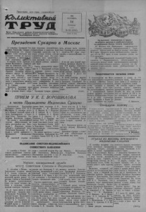 Пролетарии всех стран, соединяйтесь! 1^иже1сти£шш Орган Карасукского райкома Коммунистической партия Советского Союаа и районного Совета депутатов трудящихся Новосибирской области 1956 СЕНТЯБРЬ 14 Пятница № 115 (2146) Цена 15 коп. Президент Супарно в М оскве 11 сентября Президент Республики Индонезии Сукарно и « ровождающие его индоне- ские гости осмотрели авиационную технику на аэродроме Кубинка и наблюда.рь41о- леты реактивных самолетов. В поддень гости прибыли в здание Московского университета на Ленинских горах. Студенческая молодежь, ученые и преподаватели горячо приветствовали посланцев индонезийского народа. В актовом зале, где собралось около двух тысяч юношей и девушек, к высокому гостю обратился с приветствием министр высшего образования СССР В. П. Елютин. Президент Академии наук СССР А. Н. Несмеянов объявил о решении общего собрания отделения экономических, философских и правовых наук Академии—присудить г-ну Сукарно ученую степень доктора юридических наук. Под аплодисменты всех присутствующих высокому гостю вручается диплом доктора юридических наук. Ректор университета академик И. Г. Петровский сообщил о решении ученого совета МГУ—избрать Президента Сукарно в знак признания его больших научных заслуг почетным профессором Московского университета. В зале снова раздались аплодисменты, когда гостю был вручен диплом почетного профессора МГУ. Президент Сукарно произнес речь, которая часто прерывалась бурными аплодисментами. Студенты МГУ тепло попрощались с индонезийскими гостями. В тот же день первый заместитель министра обороны Союза ССР маршал Советского Союза И. С. Конев принял Президента Республики Индонезии доктора Сукарно, имел с ним беседу и дал в его честь завтрак. Во время завтрака маршал Советского Союза И. С. Конев и Президент Республики Индонезии Сукарно обменялись речами. Завтрак прошел в теп лой, дружественной обета новке. (ТАСС). ПРИЕМ У К. Е. ВОРОШИЛОВА в честь ПрезидентаИндонезии Сукарно Председатель Президиума - церховв^го Совета СССР К. Е. ‘ЧЯ>роши.аов 11 сентября устроил в Кремле' большой прием в честь пребывающего в Советском Союзе Президента Республики Индонезии Сукарно. На приеме с индонезийской стороны присутствовали министр иностранных дел Индонезии Р. Абдулгани, чрезвычайный и полномочный посол Республики Индонезии Л. Н. Палар и другие прибывшие с Президентом официальные лица. С советской стороны на приеме были товарищи Л. М. Каганович, Г. М. Маленков, А. И. Микоян, М. Г. Первухин, М. 3. Сабуров, М. А. Суслов, Л. И. Брежнев, Н. А. Мухитдинов, А. Б. Аристов, fl. Н. Поспелов, Е. А. Фурцева, министры СССР и РСФСР, маршалы Советского Союза, депутаты Верховного Совета СССР и Верховного Совета РСФСР, представители общественных организаций. На приеме выступил с речью Председатель Президиума Верховного Совета СССР К. Е. Ворошилов, После речи тов. К. Е. Ворошилова секретарь Президиума Верховного Совета СССР А. Ф. Горкин под аплодисменты присутствующих огласил Указ Президиума Верховного Совета СССР о награждении Президента Сукарно орденом Ленина. К. Е. Ворошилов вручил эту высокую награду Президенту Сукарно. Президент Сукарно в ответной речи поблагодарил за оказанную ему честь. (ТАСС). ПОДПИСАНИЕ СОВЕТСКО-ИНДОНЕЗИЙСКОГО СОВМЕСТНОГО ЗАЯВЛЕНИЯ 11 сентября в Москве состоялось подписание советско индонезийского со