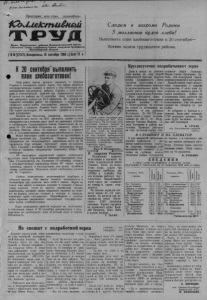 ' ‘Y " & & * . 4 ^ S ^ » Пролетарии всех стран, соединяйтесь; fCh^J*MJcrn4i£mui Т Р У Д Орган Карасукского райкома Коммунистической партии Советского Сокша и районного Совета депутатов трудящихся Новосибирской области ____ 116№1(2147)[Воскресенье, 16 сентября 1956г.| Цена 15 к. К 20 сентября выполнить • планхлебозаготовок! Наш район нынче должен засыпать в закрома Родины 5 миллионов пудов зерна. Эта цифра является государственным планом и вместе с тем почетным обязательством трудящихся района. Однако с этой большой и ответственной задачей мы справляемся плохо. В целом по району на 14 сентября план хлебозаготовок выполнен только на 66,3 процента. Во второй пятидневке сентября район не справился с доведенным графиком сдачи хлеба государству: вместо 140 тысяч центнеров в закрома Родины было засыпано только 114 тысяч центнеров. Не выполнен график и в истекшей пятидневке. Колхоз им, Молотова, например, выполнил план хлебозаготовок всего на 53,5 процента, однако в этой пятидневке он в течение двух дней не принимал участия в хлебосдаче. Сельхозартель имени Амангельды за период 11—15 сентября отправила на элеватор всего 81 центнер. Работы здесь по очистке зерна и отправке его в государственные хранилища организуются плохо. ШЪ Мало поступает хлеба из одного из крупнейших в ^районе колхозов им. Джамбула. Задание последней пятидневки эта сельхозартель выполнила всего на 30 процентов. Еще меньше поступает зерна из колхоза „Жол Сталина", который в течение пятидневки выдал • с тока в закрома государства немногим более 500 ' центнеров. Не выполнили доведенный график хлебосдачи -^колхозы зоны Хорошинской машинно-тракторной станции. Сельхозартель им. Калинина 13 сентября ссыпала в государственные хранилища более 33 тысяч пудов пшеницы, однако в последующие дни резко ослабила темпы хлебосдачи. Медленно ведет хлебосдачу колхоз им. М. Горького. Сейчас повсеместно заканчивается подборка и обмолот валков. Мы имеем полную возможность в ближайшие дни вывезти весь хлеб с токов. Зерна на токах еще много в каждом колхозе и совхозе. Однако ввиду плохого учета во многих хозяйствах трудно определить, которое зерно подлежит засыпке на семена, на фураж, сколько отошло в отходы и сколько подлежит сдаче государству. Неразбериха с учетом зерна серьезно сдерживает выполнение государственного плана хлебозаготовок. Надо немедленно навести порядок на колхозных и совхозных токах. К 20 сентября рассчитаться с государством по хлебосдаче—наш почетный долг и святая обязанность. Сдадим в закрома Родины 5 миллионов пудов хлеба! Выполнить план хлебозаготовок к 20 сентября— боевая задача трудящихся района. Доброй славой пользуется тракторист Октябрьской МТС Александр Гидеон. Он постоянно перевыполняет сменные задания, не допускает простоев техники. Летом А. Гидеон работал на подборке сена, затем на виндроуэре. Сейчас трактор т. Гидеона стоит на току второй полеводческой бригады колхоза им. Джамбула. Он приводит в движение переоборудованную силосорезку, подрабатывающую зерно. На снимке: А. Гидеон. Фото Е. Федоровского. • В закрома Родины Напряженно трудятся колхозники и горожане на токах сельхозартели имени Сталина. Здесь на подработке зерна занято три спаренных клейтона, два «ВИМа» и комбайн. Вся эта техника работает круглосуточно. Подработанное зерно сразу же засыпают на семена и сдают государст