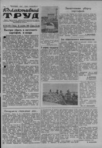 Пролетарии всех стран, соединяйтесь! ^CbUugJ&nu&mu Т Р У Д Оргав Карпсукского райкома Коммунистической партии Советского Союаа и районного Совета депутатов трудящихся Новосибирской области №120(2151) 1Сред,а 26 сентября 1956 г.| Цена 15 коп Быстрее убрать и заготовить картофель и овощи Коммунистическая партия и Советское правительство н^|^ятельно рекомендуют колхозам смелее развивать та- ки^трасли сельского хозяйства, как картофелеводство и овощеводство. Однако у нас в районе это плохо прививается. Такие колхозы, как например им. Джамбула, «Новая семья» и им. Куйбышева, посадили нынче только по 7 гектаров картофеля, а колхоз им. Дзержинского не садил вообще. Все колхозы зоны Чернокурьинской МТС посадили почти в полтора раза меньше, чем один колхоз им. Сталина. Уменьшились площади и подпосадкой овощей. Хорошо организовали уборку картофеля в колхозе им. Сталина. Здесь на эти работы были поставлены школьники и колхозники—более ста человек. В результате 35 гектаров картофеля уже убрано. Приступили к уборке картофеля в трех бригадах колхоза им. Андреева. Здесь выкопано около 20 гектаров, 750 центнеров засыпано на семена, 30 центнеров сдано государству. Начали убирать картофель все пять бригад колхоза «Маяк Ильича». Но многие колхозы все еще медлят с уборкой картофеля. Не начинал эти работы ни один колхоэ зоны Октябрьской МТС. По 4—5 гектаров убрали в колхозах им. Калинина и им. М. Горького. ^ Роль сторонних наблюдателей в уборке картофеля за- руководители машинно-тракторных станций. Копка картофеля—работа трудоемкая. Чтобы облегчить ее, государство направило в машинно-тракторные станции района 12 картофелеуборочных комбайнов. Каждая из этих машин заменяет ручной труд 30 человек. Но как ни страну а на полях колхозов работает только один комбайн. Три комбайна имеется в Хорошинской МТС. Один из направили для работы в колхоз им. Андреева. Но справиться с ниммеханизаторы не смогли. Постоял, постоял без дела комбайн на поле и отправили его снова на усадьбу МТС. Остальные два так и не выходили со станции. Около недели работает картофелеуборочный комбайн Карасукской МТС в колхозе «Маяк Ильича». В начале он часто простаивал, но в последнее время машинист его освоил лучше и комбайн начал работать неплохо. Им уже убрано 8,5 гектара картофеля. Машина с лихвой оправдала себя. Однако другие колхозы зоны Карасукской МТС убирают картофель вручную, а на усадьбе станции стоят два новых исправных комбайна. Хорошо были организованы работы по выращиванию овощей в колхозе им."Тельмана, «Вперед к коммунизму», им. Куйбышева. Здесь в основном уже закончена уборка овощей. Часть из них приготовлена для общественного питания, часть сдана государству. Руководителям колхозов и МТС нужно мобилизовать силы на то, чтобы быстрее завершить уборку овощей и особенно картофеля, рассчитаться по поставкам их государству и оставшуюся продукцию засыпать в хорошие хранилища. Колхозы и совхозы Воронежской области активно сдают хлеб государству. Ежедневно около 1.200 автомашин доставляют зерно на Калачевский пункт .Загот- зерно“ . На снимке! колонна автомашин направляется на Калачевский пункт „Заготзерно". Фото А. Зенина. Фотохроника ТАСС. Взакрома государства Колхозы и совхозы района продолжают сдачу хлеба государству. С 20 по 26 сентября они ссыпали в закрома Родины более 203 тысяч пудов зерна.