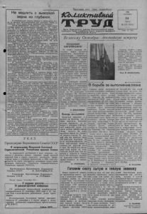 2 КОЛЛЕКТИВНЫЙ ТРУД 24 октября 1956 год, № 131 УКЯЗ ПРЕЗИДИУМА ВЕРХОВНОГО СОВЕТА СССР 06 учреждении медали „За освоение целинных земель" 1. Учредить медаль „За освоение целинных земель". 2. Утвердить положение о медали „За освоение целинных земель". 3. Утвердить описание медали „За освоение целинных земель". Председатель П р е зиди ум а Верховного Совета СССР К. ВОРОШИЛОВ . Секретарь П р е зиди ум а Верховного Совета СССР А. ГО РКИН . Москва, Кремль. 20 октября 1956 г. Положение о медали „За освоение целинных земель1 1. Медалью «За освоение целинных земель» награждаются колхозники,работники совхозов, МТС, строительных и других организаций, партийные, советские, профсоюзные и комсомольские работники за хорошую работу на освоении целинных и залежных земель в районах Казахстана, Сибири, Урала, Поволжья и Северного Кавказа. 2. К награждению медалью «За освоение целинных земель» представляются работники, проработавшие в районах освоения целинных и залежных земель, как правило, не менее двух лет. 3. На представляемых к награждению медалью «За освоение целинных земель» по каждому колхозу, совхозу, МТС, предприятию, учреждению, организации составляются списки в алфавитном порядке с указанием фамилии, имени, отчества, занимаемой должности или профессии, даты начала работы и краткой характеристики участия данного работника в освоении целинных и залежных земель. Списки подписываются председателями колхозов, руководителями предприятий, учреждений, организаций, а также секретарями партийных организаций и председателями профсоюзных организаций. 4. Списки работников, представляемых к награждению медалью «За освоение целинных земель», направляются на рассмотрение исполнительных комитетов районных Советов депутатов трудящихся, которые выносят по ним соответствующие решения и входят с представлениями о награждении в Президиумы Верховных Советов автономных республик и исполнительные комитеты краевых, областных Советов депутатов трудящихся. 5. Рассмотрение и утверждение списков на вручение медалей «За освоение целинных земель» производят от имени Президиума Верховного Совета СССР Президиумы Верховных Советов автономных республик и исполнительные комитеты краевых, областных Ссветов депутатов трудящихся. 6. Вручение медали «За освоение целинных земель» производится от имени Президиума Верховного Совета СССР председателями, заместителями председателей и членами Президиумов Верховных Советов автономных республик и исполнительных комитетов краевых, областных, районных и городских Советов депутатов трудящихся по месту жительства награжденных. Вместе с медалью награжденному вручается удостоверение о награждении установленной формы. 7. Медаль «За освоение целинных земель» носится на левой стороне груди и при наличии орденов и других медалей располагается после медали «За восстановление угольных шахт Донбасса». 8. Награжденные медалью «За освоение целинных земель» должны служить примером добросовестного выполнения своего гражданского долга. Молодежи негде отдохнуть Негде культурно отдохнуть молодежи поселка Демидовки. Очень редко привозят сюда кинокартины— один раз в два три месяца. Помещение красного уголка требует ремонта, но об этом никто не беспокоится. На стенах нет плакатов, пол грязный, потолок прокурен. В прошлом году сил