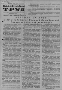 2. Коллективный т р у д 31 октября 1956 года, № 133 П Р И З Ы В Ы ЦК К П С С к 3 9 - й г о д о в щ и н е В е л и к о й О к т я б р ь с к о й С о ц и а л и с т и ч е с к о й р е в о л ю ц и и (Окончание. Начало ша 1-й стр). чи и переработки нефти и газа! Повышайте скорости и снижайте себестоимость бурения скважин! Дадим стране больше нефти, газа и нефтепродуктов высокого качества! 43. Советские энергетики, строители и монтажники электростанций и электросетей! Быстрее вводите в действие и осваивайте новые энергетические мощности! Улучшайте качество и снижайте стоимость строительных работ! Дадим стране больше электроэнергии! 44. Рабочие и работницы, инженеры и техники предприятий машиностроения и приборостроения! Быстрее создавайте и осваивайте новые виды высокопроизводительного оборудования и приборов! Настойчиво боритесь за оснащение народного хозяйства передовой техникой! Шире внедряйте комплексную автоматизацию и механизацию рабочих процессов. 45. Работники тяжелого машиностроения! Увеличивайте выпуск современных высокопроизводительных прокатных станов, горнорудного, доменного, сталеплавильного и нефтяного оборудования! Быстрее создавайте новые мощные паровые и гидравлические турбины и паровые котлы для электростанций страны! 46. Рабочие и работницы, инженеры и техники электротехнической и радиотехнической промышленности! Увеличивайте производство новейших видов оборудования, аппаратуры, приборов и других изделий высокого качества! 47. Работники химической промышленности! Шире внедряйте в производство новые технологические процессы, улучшайте использование техники и производственных мощностей! Увеличивайте производство и расширяйте ассортимент химических продуктов! 48. Советские геологи! Быстрее разведывайте богатства нашей Родины; открывайте новые месторождения железа, угля, нефти, газа, цветных и редких металлов! 49. Советские строители! Повышайте темпы и качество строительства новых промышленных предприятий, совхозов, машинно-тракторных станций, жилых домов, школ, больниц, детских и культурных учреждений! Добивайтесь сокращения сроков и снижения стоимости строительства! 50. Работники промышленности строительных материалов! Увеличивайте производство и повышайте качество цемента, сборных железобетонных изделий и других строительных материалов для строек нашей Родины! 51. Работники лесной, деревообрабатывающей и бумажной промышленности! Быстрее наращивайте производственные мощности! Полностью используйте машины и механизмы, повышайте производительность труда! Дадим стране больше лесных материалов, бумаги и мебели высокого качества! 52. Работники легкой и текстильной промышленности! Увеличивайте производство и расширяйте ассортимент товаров! Дадим больше добротных и красивых тканей, хорошей одежды, прочной изящной обуви и других товаров для населения! 53. Работники промышленности продовольственных товаров! Всемерно расширяйте производство и улучшайте качество продуктов питания! Больше сахара, жиров, мясных, молочных и других продуктов для населения! 54. Работники рыбной промышленности! Увеличивайте добычу рыбы и выпуск рыбной продукции! Улучшайте организацию производства! Повышайте качество и снижайте себестоимость продукции! Больше внимания рыбоводству и охране рыбных запасов! 55. Колхозники и колхозницы, работники МТС и с