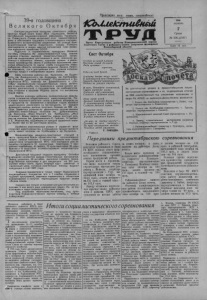 Да здравствует 39-я годовщина Великой Октябрьской социалистической революции! ТРУДОВЫЕ ПОДАРКИ ОКТЯРБЮ II —По 20 центнеров молока I! получу от каждой коровы,— ;1так решила в начале прошед- !; шего хозяйственного года пе- ;1 редовая доярка колхоза им. |; Дзержинского Софья Гейгерт. IIСвое обязательство она с jl честью выполнила, надоив от |! каждой из 11 закрепленных jj за ней коров по 2169 литров. jl Сейчас она взяла обязатель- ;! ство получить от каждой ко- Ij ровы по 22 центнера и борет- 1[ся за его выполнение. 1! На снимка: С- ГЕЙГЕРТ. Все дальше |на восток, к ; городу Кам- |ню-ва-0би, уходит новая Iжелезнодорожная маги- !страль. Впереди боевым от- !рядом идет коллектив путе- |укладочного поезда № 6, Iруководит которым Александр Тимофеевич Прядко. IКоллектив этого поезда Iкадровый, онсоздан в гроз- !ные годы Великой Отечест ' венной войны. На многих новостройках железных дорог побывал путеукладочный поезд. Он укладывал главные и вспомогатель- |ные пути на железнодорож- |ных линиях Барнаул—Ку• Iлунда, Карталы— Акмо |линек, Моинты—Чу и мно- |гих других. | В декабре прошлого года j поезд прибыл на станцию Карасук II. Выполняя специальное задание нрави |тельства, он в августе ленные районы страны - Свердловск, Ленинград, Львов и другие города. Великий Октябрь транспортники встречают нере- выоолневием плана по вывозке хлеба. Они уже перевезли более пяти милли- Целина строители желез-[онов пудов зерна, выпол- ной дороги ихлеборобы нив задание на 132 проц. Алтаяторжественно прово- А строители железной жали первыйэшелон сибир- дороги Карасук—Каменьского хлеба в город Нов на-Оби продвигаются все Дорога идет на восток проложил стальной путь до станции Целина, открыв дорогу богатому урожаю с целинных земель Новосибирской области и Алтайского края. 20 августа со ставции город. Его вел лучший машинист отделения временной эксплуатации Семен Павлович Ялин и его помощник Федор Аненко. С тех пор прошло более двух месяцев. Работники отделения временной эксплуатации новой дороги самоотверженно трудились на вывозке хлеба. Ежедневно со станций Хабары и Целина отправлялись мар к началу уборки урожая |шруты с зерном в промыш- !! Под урожай будущего г о д а Ij Напряженно трудились в М предпраздничные дни меха- ниэаторы тракторных бри- II гад С. Новака и Н. Барило jj на полях колхоза им. Куй- ;1 бышева. Убрав всю солому с I! полей, механизаторы уси- II ленными темпами вели за- I; готовку земель под урожай ;! будущего года. План взмета II зяби выполнен на 98 проц.,— ij вспахано 2272 гектара. II С перевыполнением норм ;! трудились на мощных ды- jl зеленых тракторах „С-80“ jj трактористы А. Матвеев, IIН. Мухоед, В. Михайловский !| и А. Трипель. Заготовленная jj земля—зябь и пары-пол- jj ностью обеспечивают посев- |1 ную площадь 1957 года. И. МАРТЫЩЕНКО. ЗАВОЕВАЛИ I] ПЕРЕХОДЯЩЕЕ ЗНАМЯ | |1 Карасукский пищекомбинат II ll годовой план по выпуску || j I продукции выполнил к ок-II Цтябрьским торжествам на j ji 100 проц. Особенно хорошо I I поработал коллектив ком- ' бината в I I I квартале, выполнив план на 120 проц. Новосибирское областноеI управление продовольствен ных товаров и обком союза \ рабочих продтоваров коллек- I тиву комбината вручили пе- ; реходящее красное знамя и I ден жное вознаграждение е | jj размере 6 тысяч рублей. jj В борьбе за выполнение II 1| плана хороших показателей ;| \ добились мастера кондитер-;1 \ ских изделий Н. А. Сизико- \ I] ва, выпо