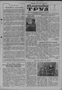 & & £ t &сЛл*>7 a f Пролетарии Т р е т и й фестиваль молодёжи Летом 1957 года в столице нашей Родины — Москве соберется юность всего мира, чтобы продемонстрировать свое единство, волю к борьбе за дело мира, за счастливое будущее народов. По решению Совета Всемирной федерации демократической молодежи здесь состоится VI Всемирный фестиваль молодежи и студентов. Всемирному фестивалю молодёжи будет предшествовать первый Всесоюзный фестиваль советской молодёжи в городе Москве, в мае 1957 года. В нашей области по решению областного комитета партии с 1 декабря будет проводиться III областной фестиваль молодёжи. Фестиваль будет проводиться в условиях повышения идейно-художественного уровня самодеятельного искусства, повышения мастер- ства'молодых исполнителей, лучшей организации молодежи и широкому привлечению её к участию в культурно-массовой работе. Фестиваль должен способствовать усилению коммунистического воспитания юношей и девушек, мобилизации сил молодёжи на активное участие в выполнении народно-хозяйственных планов развития промышленности, сельского хозяйства и культуры в районах и городах области. В нашем районе III фестиваль будет проводиться с 23 декабря. Как и в прошлом году, фестиваль проводится в четыре тура: сначала в сёлах района и на предприятиях города, затем по зонам МТС. Заключительный концерт состоится в районном Доме культуры 17 февраля 1957 года. Четвертый тур фестиваля намечается провести в г. Новосибирске в марте 1957 года. В период III фестиваля в районе пройдут конкур сы чтецов, вокалистов, инструменталистов, танцоров. В фестивале должны принять участие оркестры и ансамбли народных инструментов, хоровые, драматические, танцевальные и другие коллективы-. Одновременно с выступлением коллективов и индивидуальных исполнителей художественной самодеятельности будут проводиться выставки изобразительного и прикладного искусства и художественной фотографии. Активное участие в третьем фестивале молодежи должны принять наши самодеятельные композиторы, поэты, прозаики, авторы частушек на местные темы. Главными темами в репертуаре должны быть темы, отражающие борьбу народов за мир и дружбу между народами, трудовые успехи советского народа и трудящихся стран народной демократии. В период третьего фестиваля молодежь нашего района должна провести большую работу по оформлению и оборудованию красных уголков на животноводческих фермах, благоустройству сел и всех культпросвету чрежден ий. Для руководства проведением фестиваля бюро РК КПСС утвердило состав районного оргкомитета, обязало секретарей партийных организаций до 1 декабря рассмотреть и утвердить состав оргкомитетов в колхозах, МТС, совхозах, предприятиях и учреждениях района и города. Оргкомитеты на местах должны разработать и осуществить мероприятия по организации и проведению фестиваля, шире привлекать молодежь в кружки художественной самодеятельности, нацеливать ее на активное участие в решении хозяйственных задач, стоящих перед колхозом, совхозом, МТС, предприятием. Для проведения фестиваля понадобятся денежные средства. Сни должны быть привлечены за счет постановки платных концертов, сбора и сдачи металло- j лома, проведения воскресников, выделения из культ- г фондов колхозов, профсоюзов и т. п. Долг и 'дело чести каждой партийной, комсомольской и 