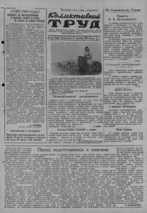 КОМСОМОЛЬЦЫ! ВЫХОДИТЕ НАСНЕГОЗАДЕРЖАНИЕ И ВЫВОЗКУ НАВОЗА НА ПОЛЯ, НА БОРЬБУ ЗА НОВЫЙ УРОЖАИ! В истекшем году на полях района собран богатый урожай. Отрадно ощущать, что в этой борьбе за хлеб есть немалая доля комсомольцев и молодежи. Большую работу прошлой зимой провели комсомольцы и молодежь колхоза им. Андреева по снегозадержанию и вывозке навоза на поля. Только комсомольцы пятой комплексной бригады этой артели под руководством своего секретаря Александра Бренделя вывезли на поля более 700 тонн навоза, на площади около двух тысяч гектаров создали большой снежный покров благодаря неоднократно проведенному снегозадержанию. Труд комсомольцев^ не пропал даром: на этом участке урожай на 2—3 центнера выше,чем на остальных, а комсомольская организация за проявленную инициативу награждена грамотой ЦК ВЛКСМ и ценным подарком. По проведению комплекса зимних агромероприятий много было сделано комсомольцами и молодежью колхозов им. Сталина, .Путь Ленина", им. Буденного и совхоза „Октябрь*. Это их труд, честный, самоотверженный и благородный обернулся осенью дополнительной прибавкой урожая. Это их труд составил частицу заслуг комсомола перед Родиной, отмеченных высокой правительственной наградой— пятым ^орденом—орденом Ленина. Сейчас начался период борьбы за урожай 1957 года. И нет сомнения, что в этой борьбе комсомольцы нашего района примут самое активное участие. К этому зовет высокий комсомольский долг и правительственная награда. Бюро райкома комсомола определило конкретную задачу всем организациям: в зимнее время вывезти на поля 20 тысяч тонн навоза и перегноя и провести снегозадержание на площади 35 тысяч гектаров. Многие комсомольские организации уже приступили к оказанию помощи колхозам и совхозам района в их борьбе за новый урожай. Комсомольцы первой фермы совхоза .Октябрь" только за один воскресник вывезли на поля более 30 тонн местных удобрений. С огоньком, с комсомольским задором поработали на вывозке навоза на поля Любовь Липовка, Зина Пышная и Мария Лавриненко. Приступили к вывозке навоза на поля и проведению работ по снегозадержанию комсомольцы колхоза имени Тельмана, .Путь к коммунизму", „Красный путило- вец*. Включились в борьбу за урожай комсомольцы и молодежь сельхозартели имени Андреева, им. Калинина и других. Товарищи комсомольцы, активнее включайтесь в борьбу за новый урожай, выходите на снегозадержание и вывозку навоза на поля! Ю. СТРИЖОВ, секретарь райкома комсомола. КОМСОМОЛЬЦЫ И МОЛОДЁЖЬ! Проведём снегозадержание на площади 35 тысяч гектаров и вывезем на поля 20 тысяч тонн навоза! Пролетарии всех стран, соединяйтесь] &Ъиа£/сгпивнбш Орган Карасукского райкома Коммунистической партии Советского Союза и районного Совета депутатов трудящихся Новосибирской области №155 (2186)1 Воскресенье, 23 декабря 1956г.|Иена 15 к. 73 года колхознику первой комплексной'бригады' сельхозартели „Путь к.коммунизму" Акыну Бараисову.Но'он продолжает добросовестно трудиться в колхозе. Много лет подряд Акын Бараисов работает скотннком-пастухом. Нынче оп пас 150 голов молодняка крупного рогатого скота, вместо 75 по норме. Он хорошо нагулял и сохранил весь молодняк. Сейчас А. Бараисов ухаживает за поставленным на зимнее содержание молодняком. Н а сним к е: скотник-пастух А. Бараисов. Фото: М. АФАНАСЬЕВА. .................................... - ■ ■■ - ★ ¥■ -------