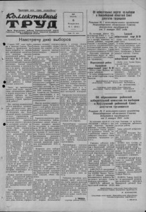 2. КОЛЛЕКТИВНЫЙ ТРУД 8 января 1957 года, № 3 Об обарозванигоиродской и сельских избирательных комиссий по выборам в городсной и сельсинеСоевтыдепутатов трудящихся Решение № 238 исполнительного комитета Карасукского районного Совета депутатов трудящихся от 30 декабря 1956 года На основании статей 51, 52, 59 и 60 «Положения о выборах в краевые, областные, окружные, районные, городские, сельские и поселковые Советы Депутатов трудящихся РСФСР» исполнительный комитет Карасукского районного Совета депутатов трудящихся РЕШИЛ: Утвердить городскую исельские избирательные комиссии по выборам в городской и сельские Советы депутатов трудящихся Карасукского района в составе следующих представителей общественных организаций и обществ трудящихся: Карасукский гооодской Совет ПРЕДЕСДАТЕЛЬ городской избирательной комиссии ГОРБ Павел Семенович—от рабочих и служащих Карасукского молочноконсервного комбината. ЗАМЕСТИТЕЛЬпредседателя городской избирательной комиссии ТВЕРДОХЛЕБ Василий Гурьевич—от рабочих и служащих Карасукского райвоенкомата. СЕКРЕТАРЬ городской избирательной комиссии КОЖЕВНИКОВА Ольга Захаровна—от учителей Дзержинской семилетней школы. ПЛЕНЫ городской избирательной комиссии: ТЫЩУК Леонид Трофимович—от учителей Карасукской средней школы, ПЛОТНИКОВИван Георгиевич—от рабочих и служащих Карасукского райпромкомби- ната, Р0Г03ИНСКИЙ Григорий Савельевич—от рабочих и служащих районной конторы связи, МАЛЬЦЕВА Ефросинья Пет ровна—от первичной Коммунистической организации завода строительных материалов, БОЖКО Иван Иванович— от рабочих и служащих Карасукского райпотребсоюза, СОСЕДОВ Алексей Антоно вич—от работников Карасукского райфинотдеда. Анисимовский сельский Совет ПРЕДСЕДАТЕЛЬ сельской избирательной комиссии ГУЛЯЕВ Иван Максимович—от первичной Коммунистической организации колхоза им. Молотова. ЗАМЕСТИТЕЛЬ председателя сельской избирательной комиссии ЛОПАТЬЕВ Николай Николаевич— от колхозников колхоза им. Молотова. СЕКРЕТАРЬ сельской избирательной комиссии БИКЕЕВА Валентина Афанасьевна— от первичной организации Всесоюзного Ленинского Коммунистического Союза молодежи колхоза им. Молотова. ЧЛЕНЫсельской избирательной КОМИССИИ: ПЕТРУШЕНКОВера Ивановна—от колхозников колхоза им. Молотова. КРАОСВСКИЙ Леонид Иванович—от колхозниковколхоза им. Молотова. Благодатский сельский Совет ПРЕДСЕДАТЕЛЬ сельской избирательной комиссии СМА- КОТЙН Антон Куориянович— от первичной Коммунистической организации колхоза им. Тельмана. ЗАМЕСТЕИЛЬ председателя сельской избирательной комиссии ДАНЬКО Надежда Егоровна—от коллектива учителей Благодатской средней школы. СЕКРЕТАРЬ сельской избирательной комиссии ПОПОВА Анна Алексеевна—от колхозников колхоза им. Тельмана. ЧЛЕНЫ с е л ь с к о й и з б и р а т е л ь н о й КОМИССИИ: ШАПРОЕНКОПетр Харитонович —от рабочих и служащих Благодатского сельского потребительского общества, ОБУОХВ Капитон Алексеевич—от ко£.озников колхоза им. Тельмана. Богословский сельский Совет ПРЕДЕСДАТЕЛЬ сельской избирательной комиссииШНЯН ИванПрохорович—от собрания граждан села Богословки. ЗАМЕСТИТЕЛЬ председателя сельской избирательной комиссии МИЛ0НЧУКСемен Полпкарпович—от собрания граждан села Богословки. СЕКРЕТАРЬ сельской избирательной комиссии ВОРОБЬЕ ВА Мария А