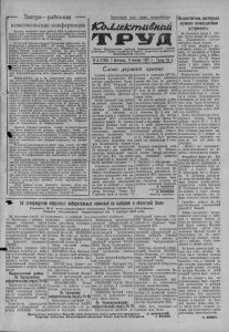 Завтра— районная комсомольская конференция Завтра начинает свою работу XXXI-я районная комсомольская конференция. Это важное событие в жизни районной комсомольской организации. Конференция подведет итоги работы эа 14 месяцев. Отчетный период насыщен большими событиями. Состоявшийся в феврале 1966 г. XX съезд Коммунистической партии Советского Союза дал развернутую программу борьбы советского народа sa дальнейшее строительство коммунистического общества в нашей стране. Комсомол, с присущими ему энтузиазмом и энергией, активно взялся за осуществление величественных партийных директив. В это общее дело борьбы вносят свой посильный вклад комсомольцы и молодежь fgtijero района. В том, что наш район нынче вырастил рроший урожай, вовремя убрал его и досрочно рассчитался с государством по хлебопоставкам и другим видам сельхозпродуктов, есть немалая заслуга молодежи. Всему району, да и за пределами его, известно имя знатного комбайнера Федора Шнайдера, ежегодно перевыполняющего сезонные задания и добивающегося высокого намолота зерна. Одними из лучших в Октябрьской МТС являются молодые трактористы А. Бейфус и А. Май. Комсомолки Е. Жерноклев, Д. Киндер, А. Котлярова-, А Морозова надоили в прошедшем хозяйственном году более чем по 2 тонны молока от каждой фуражной коровы и завоевали передовые места в соревновании доярок района. С гордостью называют колхозники имена комсомольцев: телятницы М. Дорнес, свинарки М. Шрейдер, пастуха В. Туркова, чабана М. Ша- поренко и многих других. Образцы труда на стройке новой железкой дороги показывают И. Ющак, Л. Мальцева, А. Рылов. Более двух годовых норм дали в1966 году жестянщик завода строительных материалов А. Головин, швея Н. Разумовская. На высоких скоростях водят свои машины шоферы В. Загреба, Я. Кладниц- кий, Н. Герасимчук, О. Семенюченко. Однако, отдавая должное всему положительному что было, делегаты не должны закрывать глаза на |меющиеся недостатки в работе. Основная задача ком- _|мола— это воспитание молодежи в коммунистическом J^xe. Как справлялись с этим первичные организации, райком комсомола,— вот предмет разговора на конференции. Районная организация в этом году взяла на себя почетное обязательство— силами комсомольцев и молодежи вывезти 20.000 тонн навоза и провести на 36 тысячах гектарах снегозадержание. Делегаты должны рассказать на конференции, как выполняются эти обязательства. Отстающим участком в комсомольской работе является организация политической учебы комсомольцев и молодежи, развитие физической культуры и спорта. В критических выступлениях необходимо вскрыть причины этих недостатков, найти пути их устранения. С трибуны конференции должен смело звучать голос деловой, принципиальной критики и самокритики. Только таким путем комсомольская организация сможет вскрыть допущенные ошибки, чтобы недопустить их в будущем. Надо помнит1, слева великого Ленина: .Если мы не будем бояться говорить даже горькую, тяжелую правду напрямик, мл научимся, непременно и безусловно научимся побеждать все и всякие трудности*. Пролетарии всех стран, соединяйтесь; IGKUekxnuiumi Орган 'Карасукского райкома Коммунвствческой иартии Советского Союза и райовного Совета депутатов трудвщвтся Новосибирской области №5 (2193) [ Пятница, 1 января 1957 г. ! Цена 15 к. Слово держат крепко Горячим одобревием встретил коллектив Х