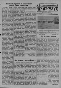 Серьезные упущения в политической работе среди избирателей ПРОЛЕТАРИИ ВСЕХ СТРАН, СОЕДИНЯЙТЕСЬ| КЪил£&ти£нш ч ■ч » Орган Карасукского райкома Коммунистической партии Советского1.Союза и районного Совета депутатов трудящихся Новосибирской области №15(2203) [Воскресенье,3 февраля1957 г. j Цена 15 к, •-. '-"S'С.'V а ' .; - *■- Механизаторы Новороссийской МТС(Актюбинская область) проводят снегозадержание на полях колхозов .Искра", имени Хрущева и других. Они прикатывают снег. Теперь его не сдует ветер, весной в почве будет накоплено достаточное количество влаги. На снимке: механизаторы Новороссийской МТС прикатыва ют снег на полях колхоза .Искра '. Фото Д. Карачуна. Фотохроника ТАСС. Для будущего урожая Подготовка к выборам в местные Советы принимает все более широкий размах. Успех этой важной кампании будет зависеть от состояния политической работы в массах. Учитывая это, некоторые партийные организации Карасукского района привлекли для агитации среди населения большой актив. В селе Благодатном, где находится колхоз имени Тельмана, на десятидворки вышли 27 агитаторов. Это, главным обоазом, хорошо подготовленные коммунисты и комсомольцы из среды сельской интеллигенции и колхозников. Они разъясняют избирателям Положение о выборах, решения декабрьского Пленума ЦК КПСС, Обращение партии и правительства ко всем работникам сельского хозяйства. Рассказывая, что наша об ласть и тысячи передовиков удостоены высоких правительственных наград за заслуги в освоении целинных и залежных земель, проведении уборки урожая и хлебозаготовок в 1956 году, агитаторы словом и делом поднимают колхозников и механизаторов на дальнейший подъем земледелия и животноводства. К этому зовет и наглядная агитация во всех общественных зданиях села. Неплохо ведут агитационномассовую работу парторганизации совхоза имени Дзержинского, артели «Новая семья» и другие. Но в целом ао району политическая работа на избирательных участках развернута слабо. Райком КПСС и многие парторганизации с большим опозданием приступили к открытию агитпунктов и налаживанию их деятельности. Как показала проверка, до половины января ни в одном из них по существу ничего не было сделано. Помещения, отведенные под агитпункты, оборудованы плохо, в них холодво и неуютно, отсутствуют наглядная агитация и литература. В с. Ново Карасук и в клубе железнодорожников станции Карасук агитпункты до последнего времени не были открыты. В селе Студеном агитпункт размещен в рабочей комнате председателя и секретаря сельсовета. Дежурства не установлены, и ка к только рабочий день в Совете заканчивается, помещение закрывается. В селе Октябрьском агитпункт находится в полутемном уголке сельского клуба. Не лучше оборудованы и оформлены некоторые агитпункты и в городе Карасуке. ^Неудовлетворительно поставлена работа с агитаторами. В этом повинен, прежде всего, отдел пропаганды и агитации райкома партии. Он не знает, что делается на местах. Некоторые первичные партийные организации всю массово-политическую работу среди избирателей возложили только на комсомольцев и несоюзную молодежь. В колхозе имени Молотова из 16 членов КПСС нет ни одного агитатора, в то время ка к в составе агитколлектива этой парторганизации есть люди, совершенно не подготовленные для проведения политической работы в массах. Значител