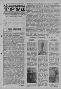 2. Наказ кандидату в депутаты Хоть и не в первый раз шла на свою десятидворку к избирателям агитатор Елена Гавриловна Никитенко, но в этот вечер волновалась больше обычного. Да и как не волноваться: сегодня намечена встреча с кандидатом в депутаты. ... Село погрузилось в сумерки. И когда в окнах сельчан вспыхнули яркие огоньки электричо ских лампочек, в помещение школы один за другим стали входить избиратели. На встречу с кандидатом в депутаты Октябрьского сельского Со вета Хростьяном Петровичем Германом собрались почти все избиратели десятидворки Елена Гавриловна рассказала присутствующим о последних событиях в стране. Затем она ознакомила избирателей с трудовой и общественной деятель ностью кандидата. Не легкий жизненный путь прошел Хрестьян Петрович. С ранних лет гнул Ьпину на кулака. Только Советская власть дала ему возможность обрести настоящее счастье. В 1930 году одним из первых он вступил в организованное коллективное хозяйство и с тех пор все годы его жизни связаны с колхозом. Он является членом правления артели «Путь Ленина». На любом участке работы т. Герман проявляет себя как заботливый хозяин. Собравшиеся тепло отзывались о Хрестьяне Петровиче, характеризовали его как честного тружени ка и обещали в день выборов единодушно отдать за него свои голоса. Одновременно давали ему свой наказ. Домохозяйки П. Хмелев- ская и М. Шкитиеа ' просили кандидата поставить вопрос перед соответствующими организациями о строительстве в селе Октябрьском школы-десятилетки и нового клуба. Избиратели обратили внимание также на то, чтобы сельской Совет больше проявлял заботы о благоустройстве населенных пунктов. Б конце встречи высту- нил X. П Герман. Он поблагодарил избирателей за оказанное доверие и заверил их, что не пожалеет сил по претворению наказа в жизнь. — Не забывайте о нас,— напутствовали избиратели своего кандидата в депутаты,— а мы всегда помо жем выполнить наказ. И в этих словах чувствовалась законная гордость простых тружеников, имеющих право избирать и быть избранными в Советы- органы подлинного народовластия. В. ВЕЙФУС. ЖДЕМ АГИТАТОРА Горячая пора сейчас в агитационно-массовой работе. Агитаторы разъясняют избирателям существо нашей избирательной системы, помогают разобраться в международной обстановке. Но этого не чувствуется на нашей улице имени Луначарского, где агитационную работу должны вести агитаторы парторганизации райисполкома. Я и многие наши соседи не знаем своих кандидатов, не знаем, на каком избирательном участке мы будем голосовать и где проверить себя в списках избирателей. Т. ГЛАДКИХ, домохозяйка. КОЛЛЕКТИВНЫЙ ТРУД 15 февраля 1957 года, № 29 Карасук позоронтсотает с надоями молока Областную сводку по надоям молока замыкает Карасукский район. Его намного обогнали соседи— крупипцы, веселовцы, андреевцы. Правда, продуктивность коров по сравневию с тем же периодом минувшего года в районе повысилась, но в прошлую зимовку не хватало кормов. Приходилось использовать камыш, кочки, ветки. Покупали сено в отдаленных районах. Нынче же с кормами обстоит благополучно. Более благоприятные условия и для содержания скота, но используются они плохо, фуражные запасы расходуются неправильно. Вот как кормят скот, например, в первой бригаде колхоза имени Калинина. По 5—6 дней подряд здесь из-за перебоев с подвозкой се