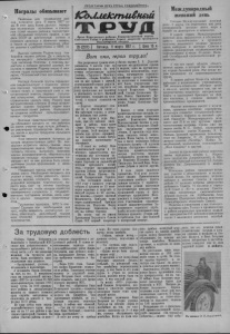 Награды обязывают Памятным для трудящихся района останется день 6 марта 1957 года. В этот день более двухсот передовых тружеников колхозных и -совхозных полей нашего района в торжественной обстановке получили ордена и медали СССР за достигнутые успехи в освоении целинных и залежных земель, а также за успешное проведение уборки урожая и хлебозаготовок в 1966 го ду. Высоко оценила Родина труд хле боробов нашего района. Да и результаты минувшего сельскохозяйственного года неплохие. Колхозы и совхозы вырастили и собрали высокий урожай, отгрузили в закрома Родины около 4 миллионов пудов кулундинского добротного зерна. Полновесней стал колхозный трудодень. Награда большой группы передовиков свидетельствует о подлинно массовом героизме тружеников социалистических полей, о творческой силе и неисчерпаемой энергии рядовых строителей коммунизма, объединенных единым стремлением сделать свою Родину еще могущественнее и богаче. В лице награжденных оценен трудовой подвиг всех тружеников полей района, борющихся за создание изобилия сельскохозяйственных продуктов. Высокие правительственные награды обязывают каждого из нас работать на своем участке еще лучше, добиваться увеличения производства зерна, мяса, масла и других продуктов сельского хозяйства. Уже немного времени осталось до начала весенне-полевых работ. Во всеоружии встретить весну— такова наша первоочередная задача. Образцово подготовить технику, выполнить комплекс зимних агромероприятий, обеспечить всю посевную площадь кондиционными семенами— вот на чем должны быть сосредоточены усилия колхозников и механизаторов. Решающий период наступает в зимовке скота. Необходимо направить все усилия к тому, чтобы увеличить производство молока, сохранить весь народившийся молодняк, благополучно вывести весь скот на летние пастбища. Надо добиться, чтобы каждое хозяйство своевременно справилось с государственными поставками молока, мяса, шерсти и других продуктов животноводства. Труженики колхозов, МТС и совхозов! Сделаем все необходимое для того, чтобы закрепить достигнутые ус пехи, обеспечить дальнейший подъем всех отраслей сельскохозяйственного производства. ПРОЛЕТАРИИ ВСЕХ СТРАН, СОЕДИНЯЙТЕСЬ) ^CbJaeJcmufomu Т Р У Д Орган Карасукского райкома Коммунистической партии Советского Союза и районного Совета депутатов трудяювхся Новосибирской области 29 (2217) | Пятница, 8 марта 1957 г. | Цена 15 к. Вот они, герои труда! Зал разразился громом аплодисментов. У многих уже на лацканах пиджаков, на кофточках поблескивали ордена Ленина, «Трудового Красного Знамени», «Знака Почета». Но они на миг забыли о личной, переполнявшей сердце радости. «Они смотрели на идущего по |залу преклонных лет человека "и радовались за него. Василий Дмитриевич, опираясь на тросточку, с трудом поднялся на сцену. — Дорогие товарищи!— ска зал он в ответном слове,— Мы работали хорошо, а должны работать еще лучше. А на груди у деда Мар- тыко, как его любовно называют в районе, сиял орден «Знак Почета»— знак трудовой славы. Этой мыслью: трудиться еще лучше— проникнуты все сидящие в зале. Награды радуют, вдохновляют и обязывают. — В ответ на заботу Ком мунистической партии и Советского правительства, удостоивших нас почетными наградами,мы будем еще настойчивее бороться за дальнейший подъем артельного хозяйства,— говори